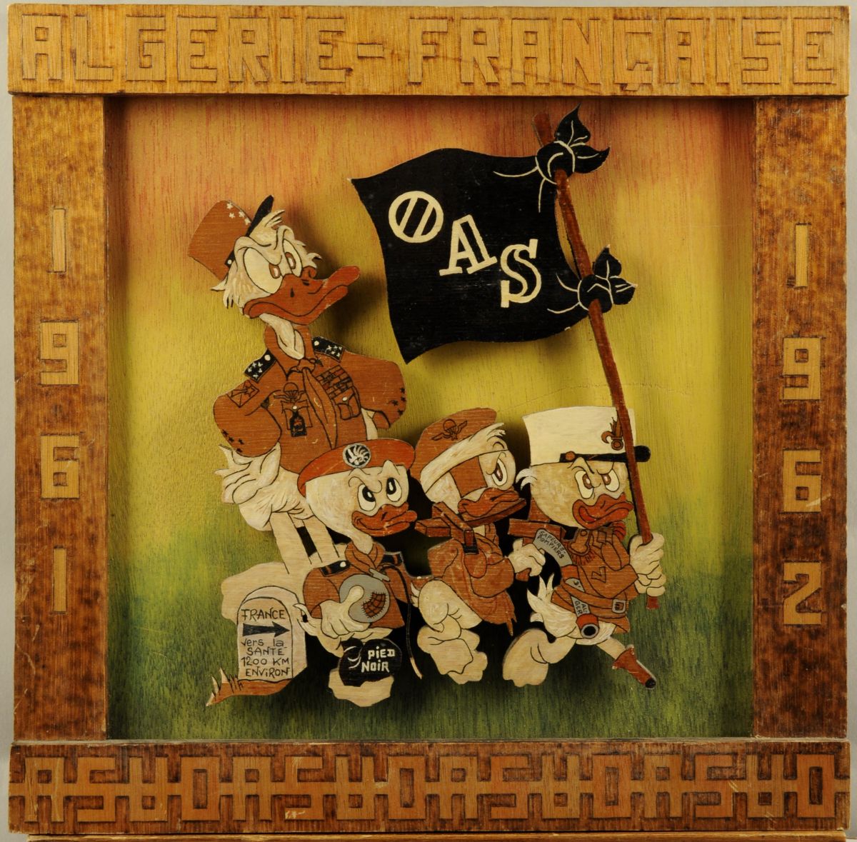 4 personnages, canards-Donald à la Walt Disney : général 4 étoiles, légionnaire portant une bombe, parachutiste borgne et sapeur pompier d'Algérie invalide - défilant et portant un drapeau noir "OAS", avec borne kilométrique : " FRANCE vers la SANTÉ 1200 km environ " - et l'insciption " Pied Noir ".