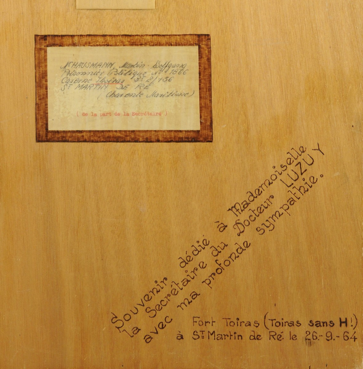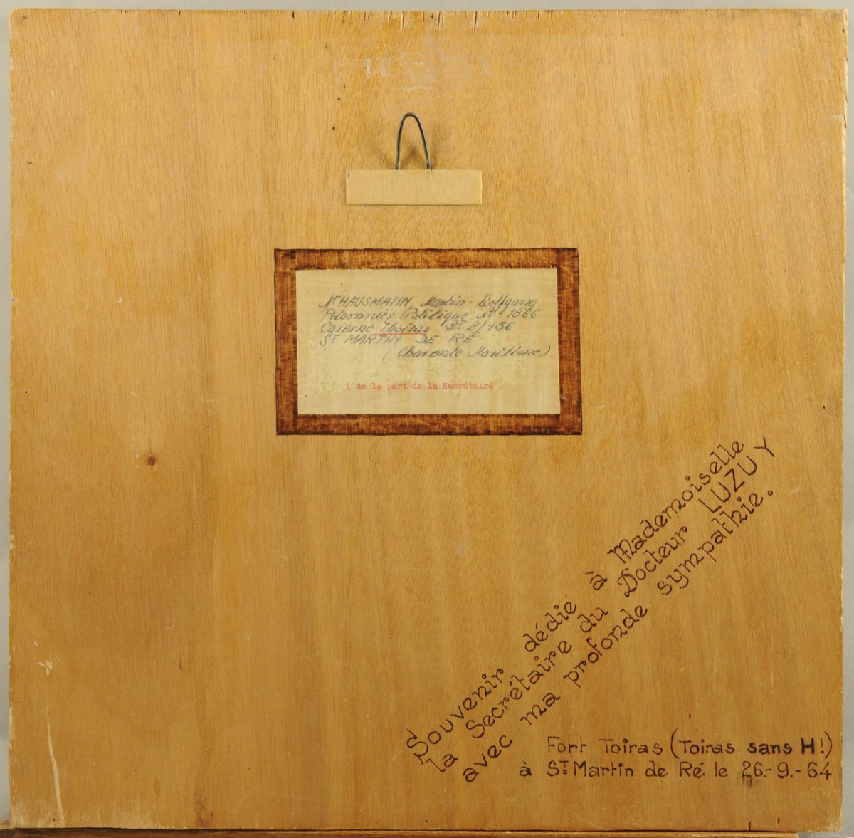 - pyrogravé : " Souvenir dédié à Mademoiselle la sécrétaire du Docteur Luzuy avec ma profonde sympathie. Fort Toiras (Toiras sans H !) à St Martin de Ré le 26.9.64 "