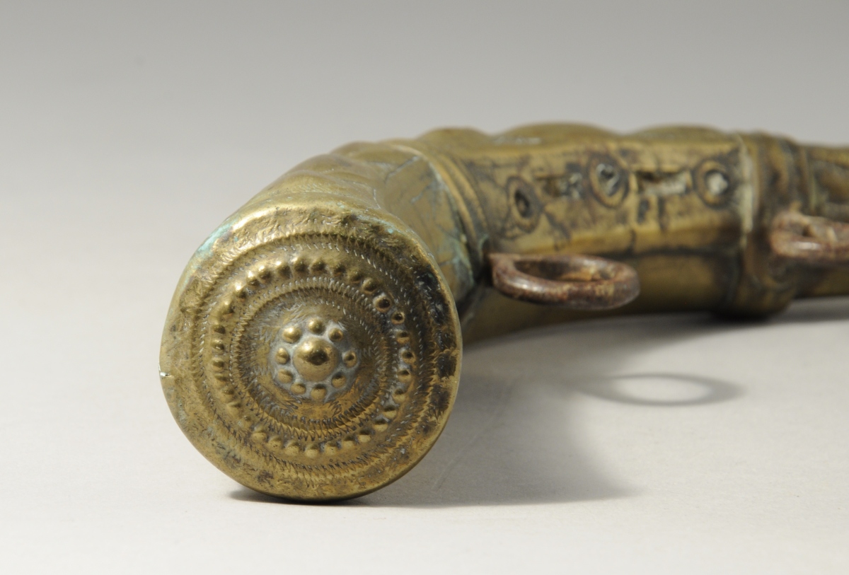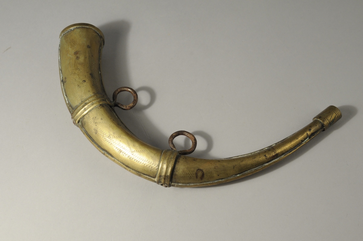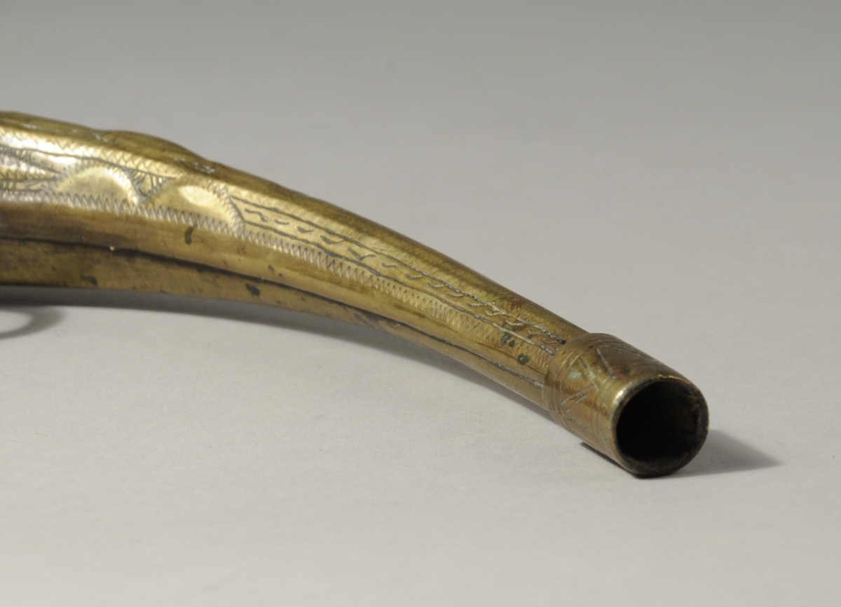 ORIENT. POIRE À POUDRE en laiton à frises d'olives et de fuseaux. Deux anneaux de fer.