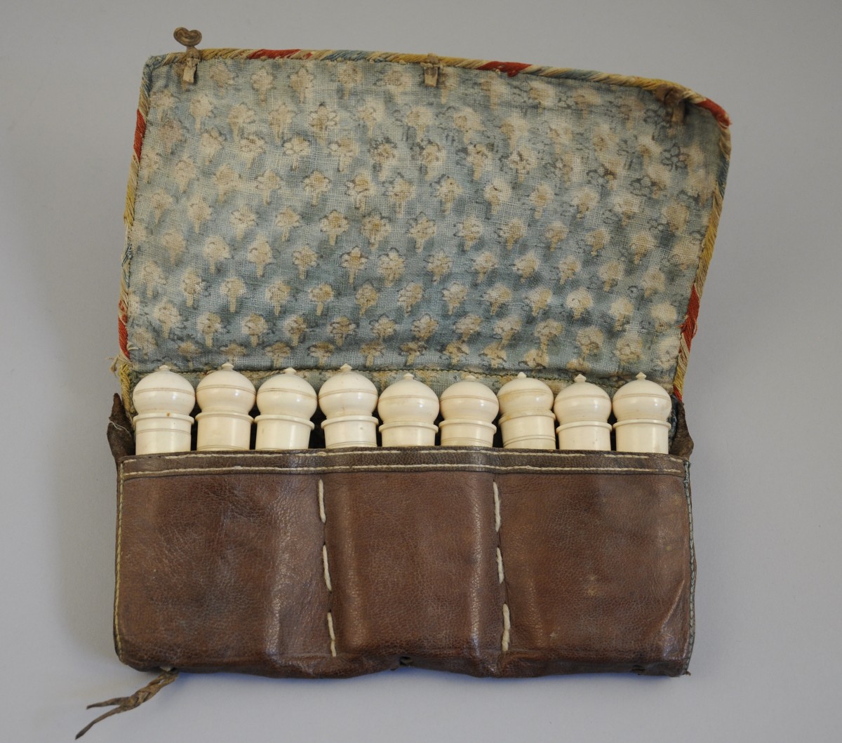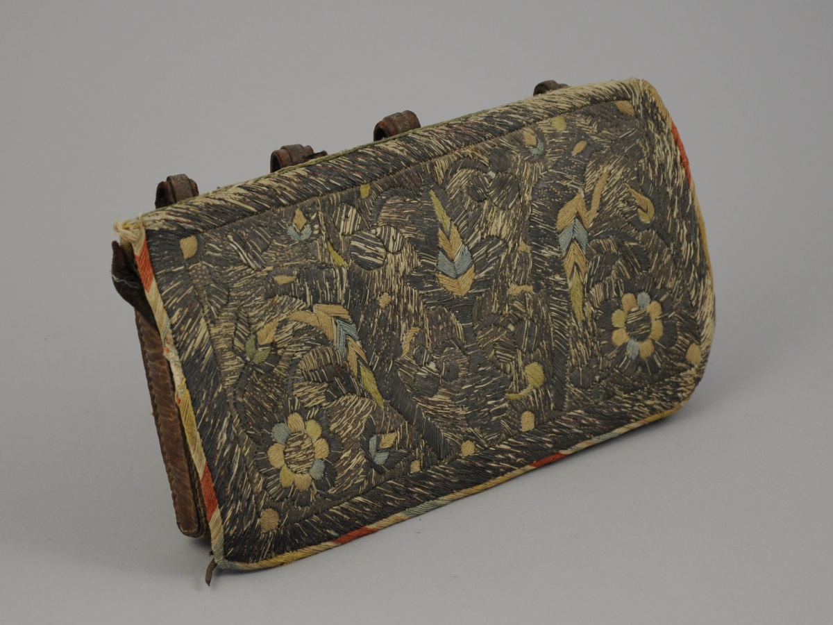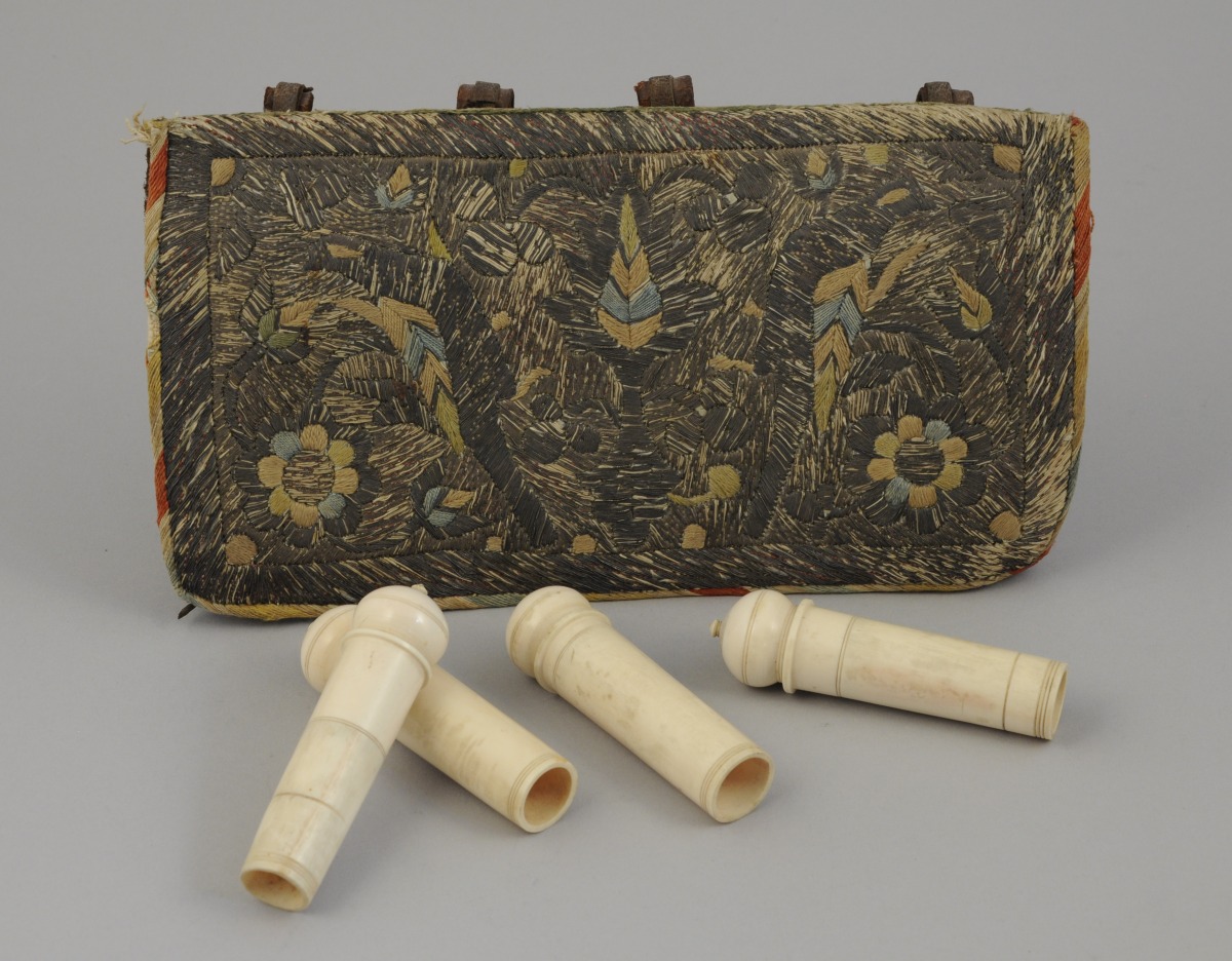 CAUCASE. CARTOUCHIÈRE en cuir. Pochette rectangulaire, à rabat brodé de fils métalliques et polychromes, dessinant une composition florale. À l'intérieur, trois compartiments contiennent neuf petits cylindres en os achevés en dôme.