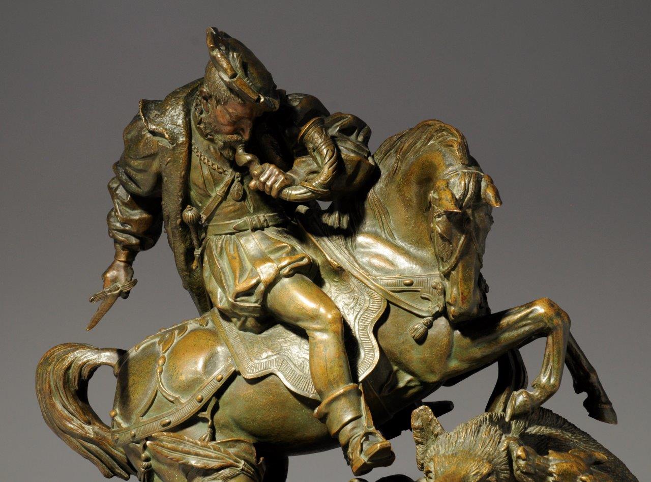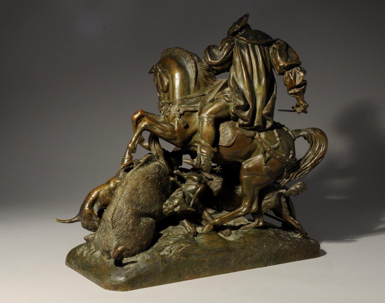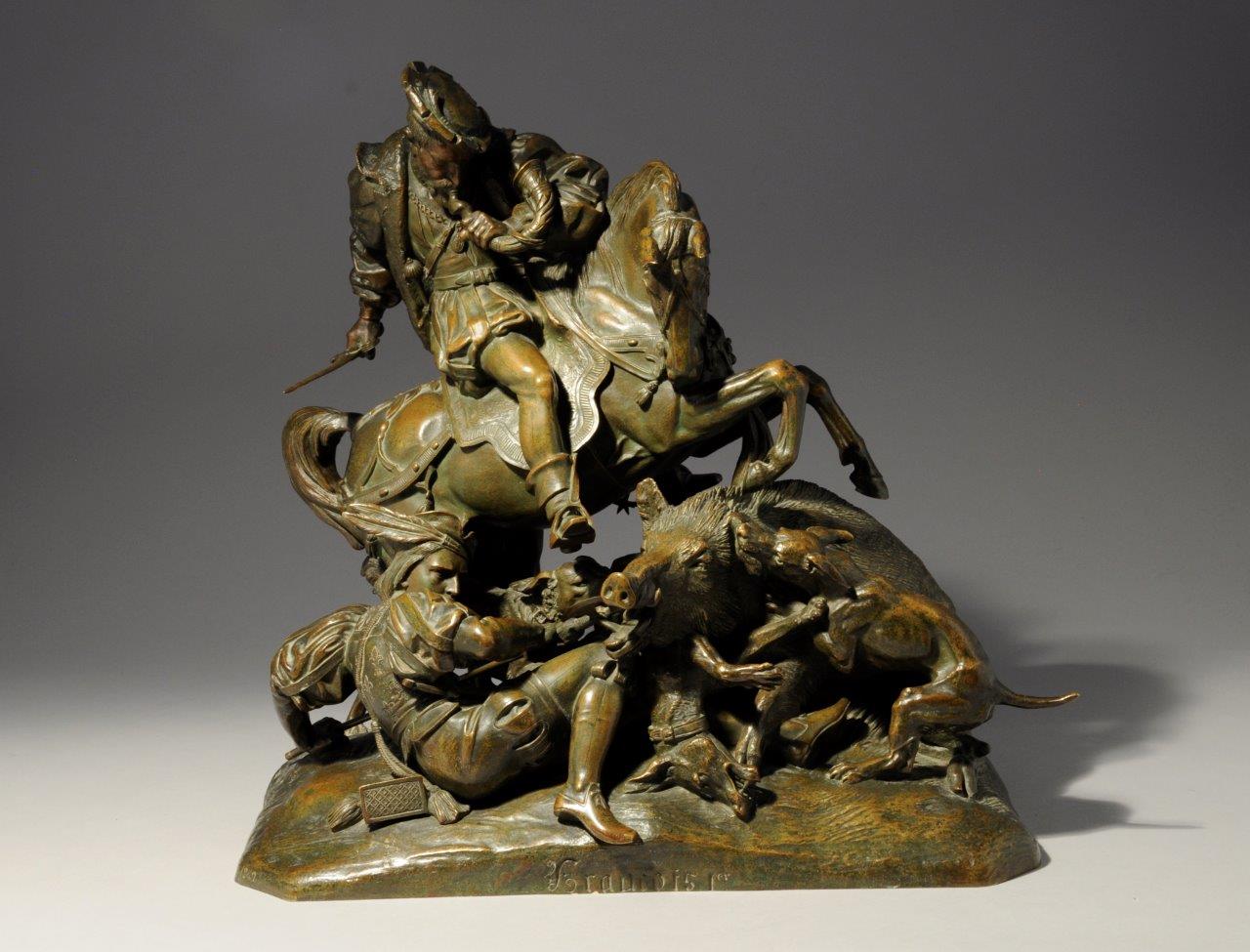 Un bronze de ce modèle est conservé dans la salle François Ier au château de Chambord. Notre bronze est daté 1842 : soit un an avant les plus anciennes version jusqu'alors répertoriées. Il présente une patine légère et un très grand soucis du détail de ciselure, signe des meilleures pièces.
