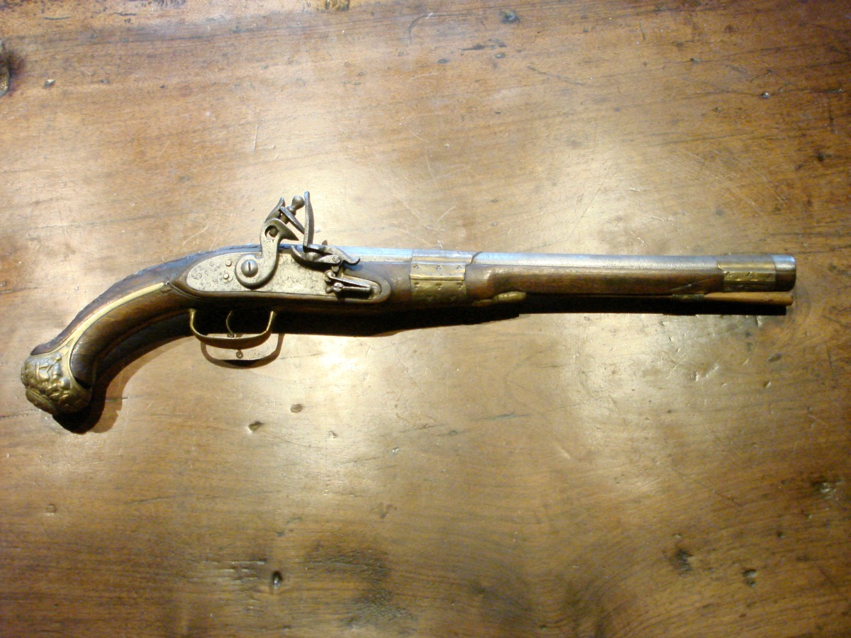 Canon rond à pans au tonnerre. Patine et chien à corps plats unis. Garnitures en cuivre et laiton, gravées et ciselées. Baguette en bois. Crosse en noyer en partie sculpté, avec pièce de pouce.