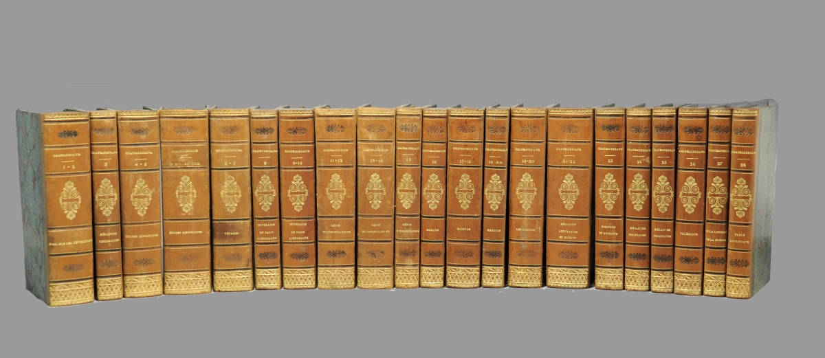 Première édition collective, "de loin la plus intéressante et la plus recherchée" (Clouzot, p. 38). Elle renferme un certain nombre d'éditions originales, parmi lesquels Les Natchez, Le dernier Abencérage, le Voyage en Amérique, etc....