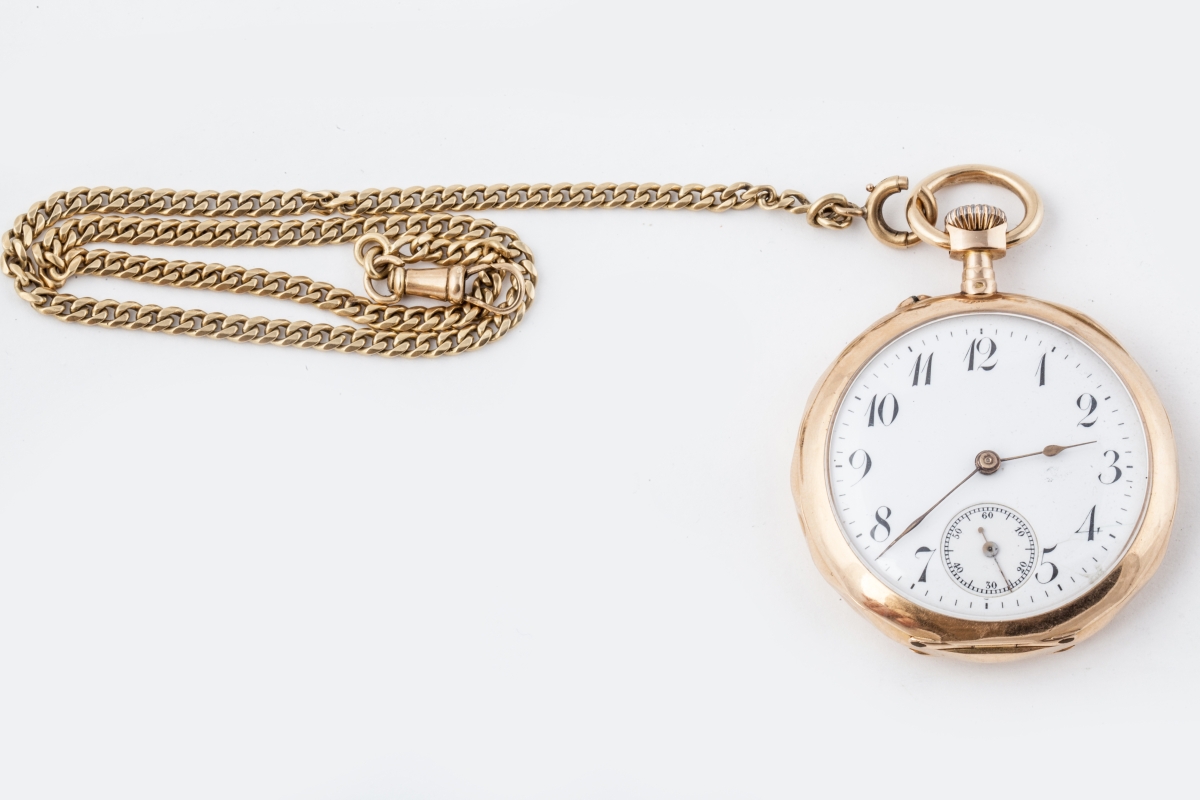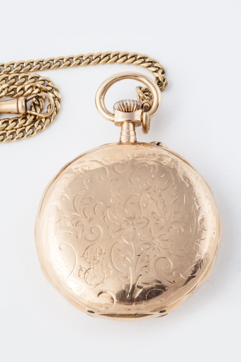 Avec sa CHAÎNE GILETIÈRE en or à mailles gourmettes. Long. 36 cm. Poids 18,1 g.