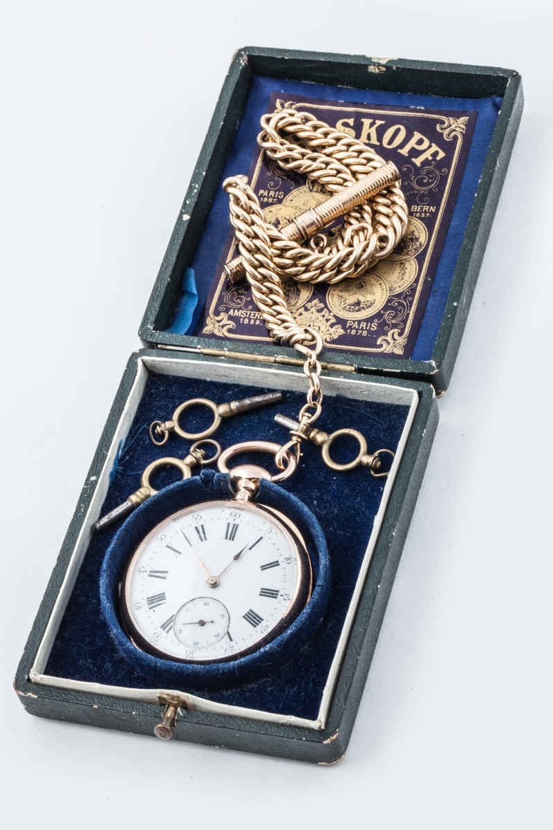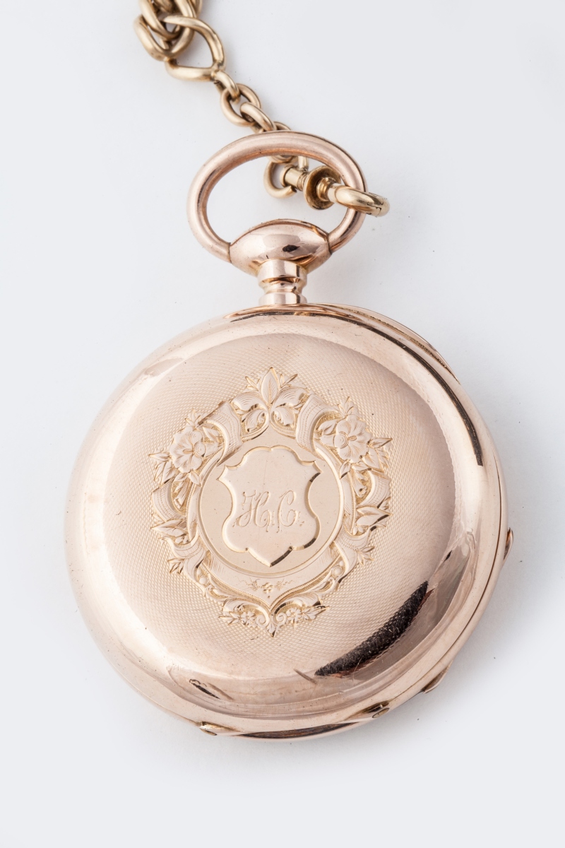 MONTRE DE GOUSSET à clé en or jaune, à deux cadrans émaillés. Le grand cadran avec les heures en chiffres romains, gradué pour les minutes et ponctué en chiffres arabes pour chaque période de 5 minutes ; le petit cadran gradué pour les secondes, ponctué en chiffre arabe pour chaque période de 10 secondes. Le dos du boitier guilloché avec un cartouche fleuri monogrammé "HC".