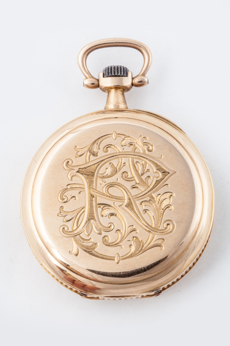 LIP. REMONTOIR d'homme en or à double cadran. Signé sur le cadran émaillé : Micromètre Lip spiral cylindrique. N° 88440. Initiales RJ sur le couvercle.