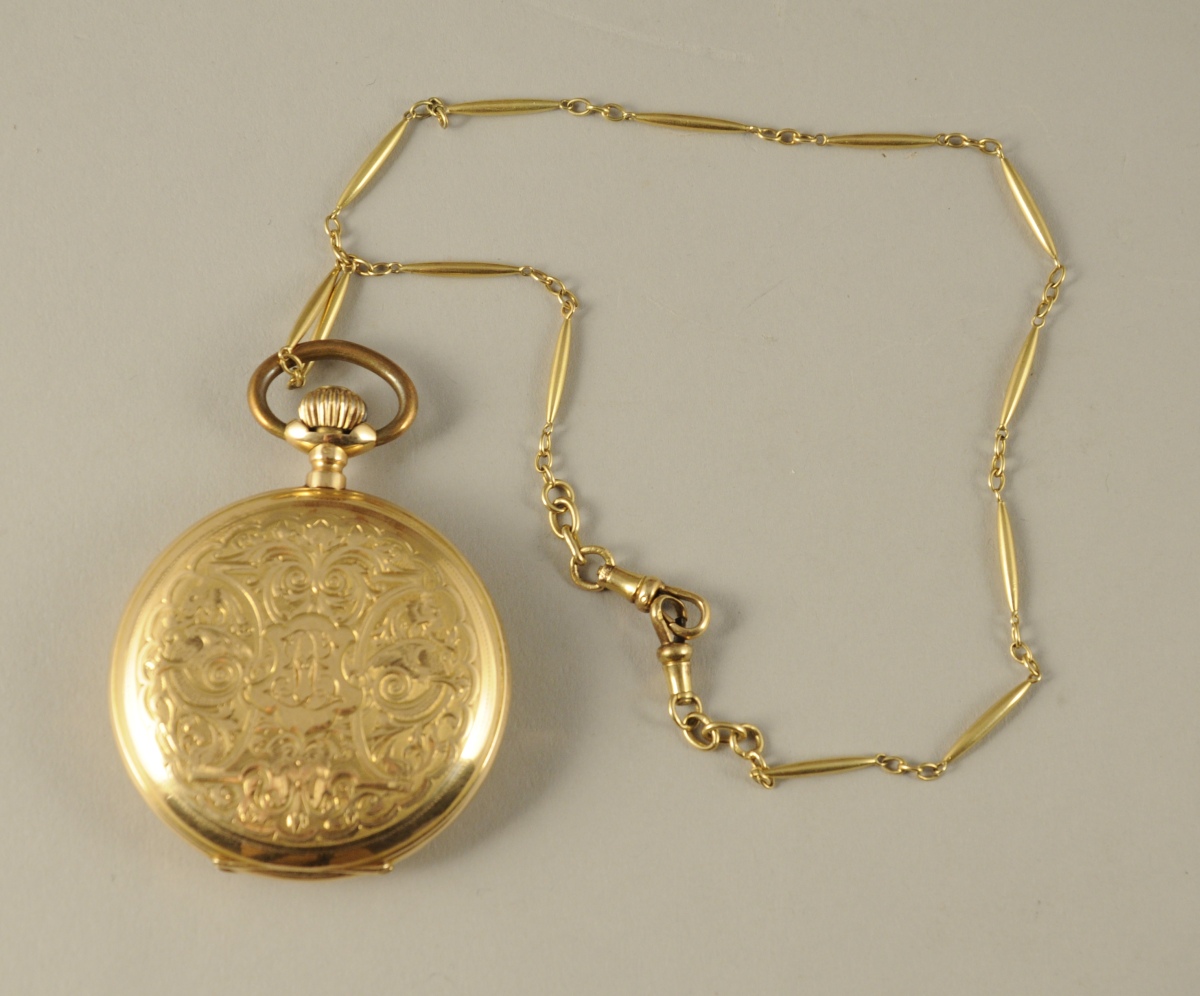 MONTRE À GOUSSET en or jaune, spirale Breguet, cadran émaillé gradué pour les minutes, les heures en chiffres romains, chaque période de 5 minutes en chiffres arabes. Chaine giletière en or jaune.