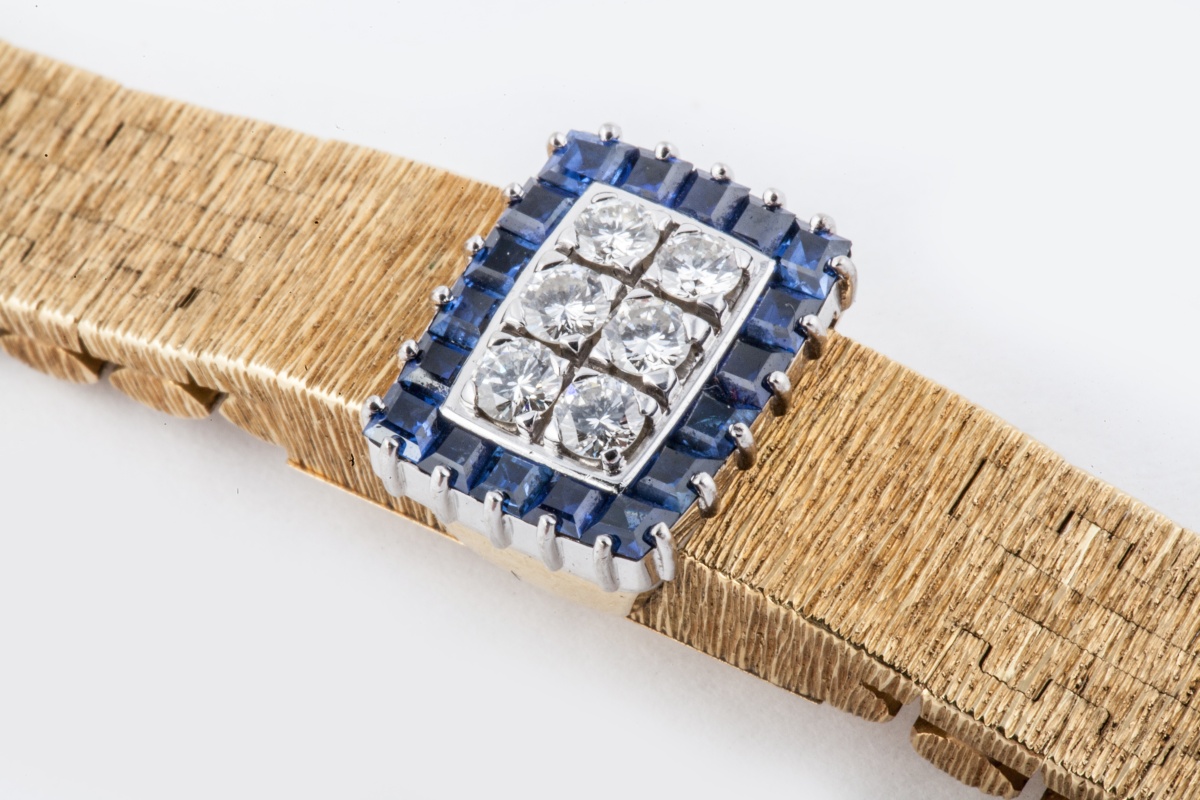 MONTRE-BRACELET de dame, en or jaune 18K (750 millièmes) satiné, la montre dissimulée sous un motif serti de six diamants dans un entourage de saphirs calibrés, tour de poignet articulé, mouvement mécanique.