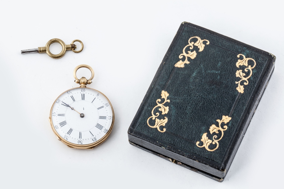 Petite MONTRE À GOUSSET d'homme en or jaune cadran émaillé gradué pour les minutes, les heures en chiffres romains, chaque période de 5 minutes en chiffres arabe. Clé.
