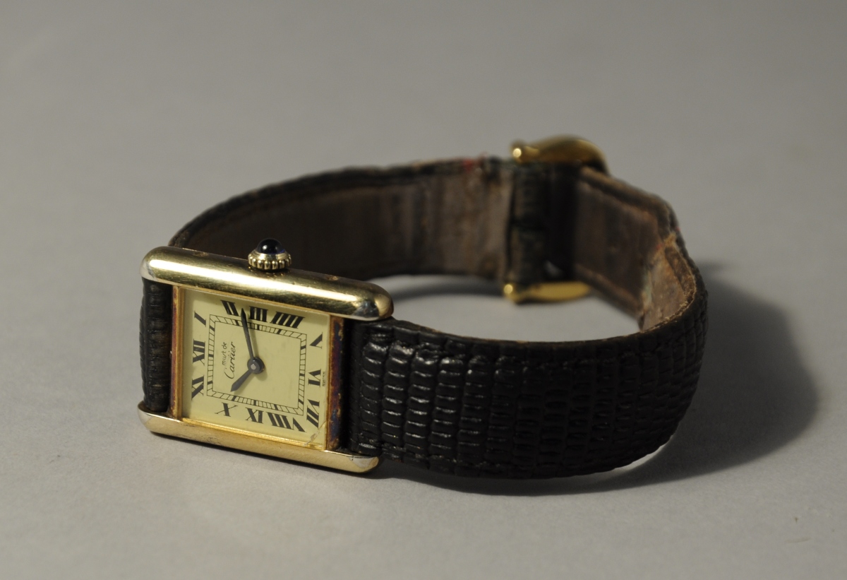 CARTIER. MONTRE-BRACELET TANK MUST de dame. Le boîtier de forme rectangulaire en vermeil. Cadran crème à chemin de fer indiquant les heures en chiffres romains. Aiguilles glaive en acier bleui et remontoir cabochon en saphir. Le boîtier signé et numéroté "3071813".