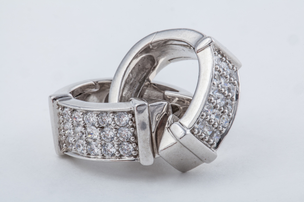 PAIRE DE BOUCLES D'OREILLES en argent, (système pour oreilles percées), ornée d'un pavage de pierres de synthèse blanches.