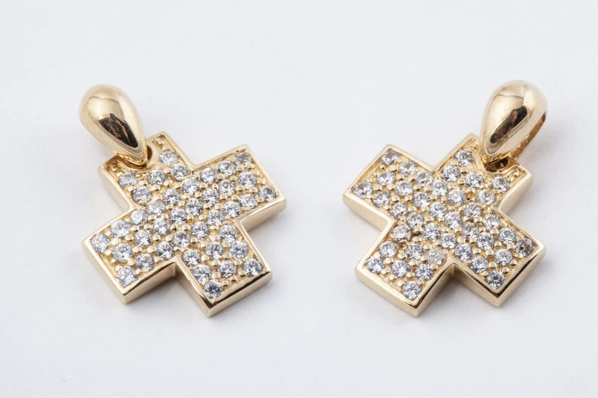 Lot comprenant DEUX PENDENTIFS croix en or jaune sertis de pierres de synthèse blanches.