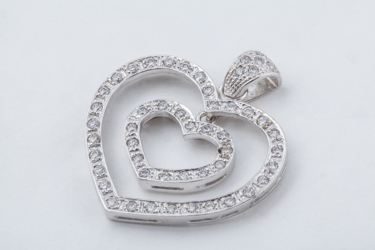PENDENTIF "double coeur" en or gris serti de pierres de synthèse blanches.