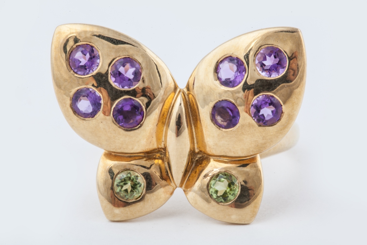 BAGUE "papillon" en or jaune partiellement sertie d'améthystes.