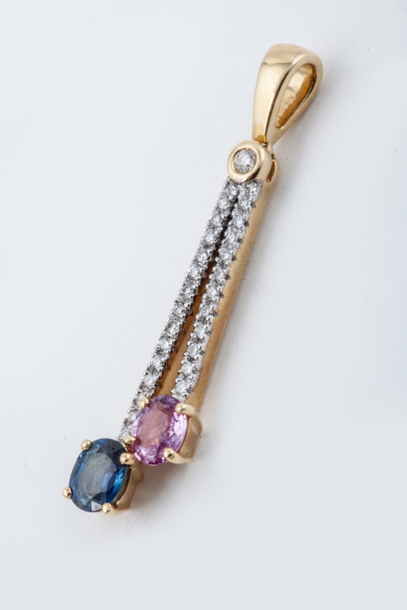 PENDENTIF en or jaune composé de deux lignes de brillants retenant deux saphirs, rose et bleu.