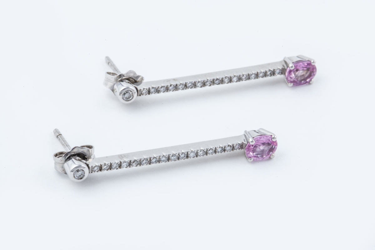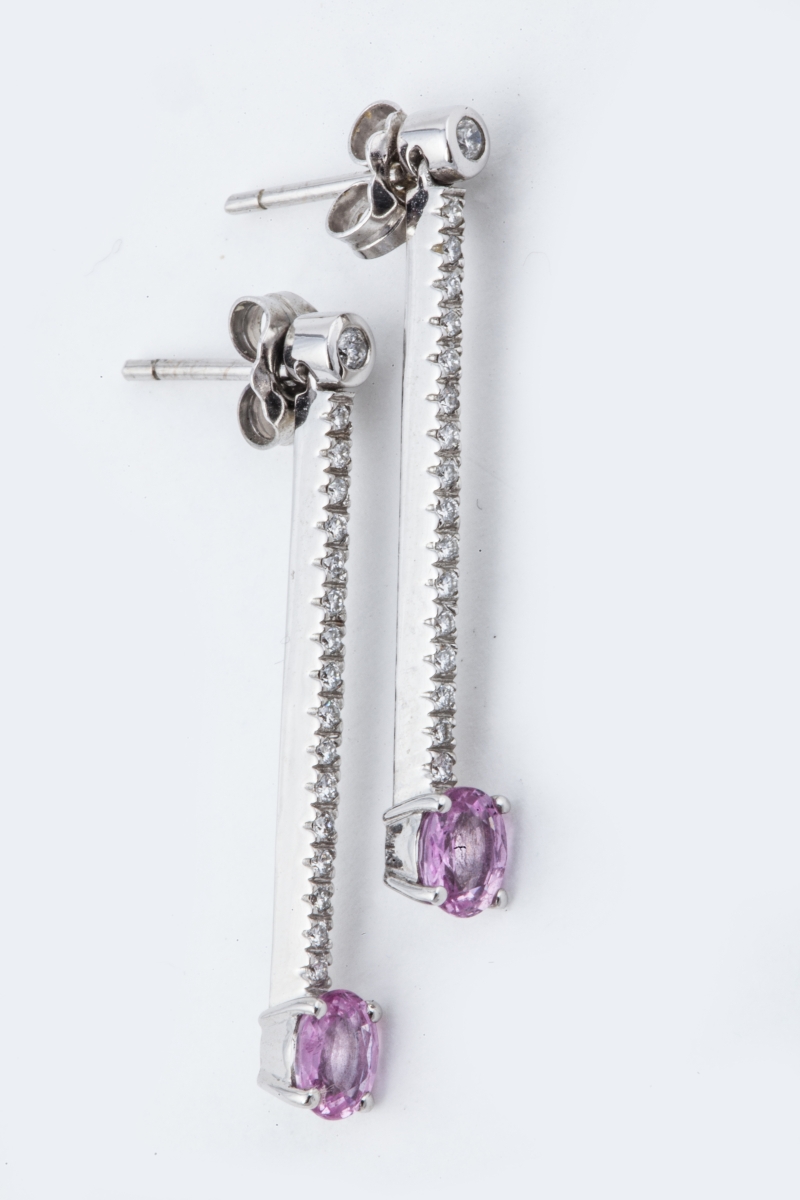 PAIRE DE PENDANTS D'OREILLES en or gris, chacun serti d'un saphir ovale de couleur rose surmonté d'une ligne de brillants.