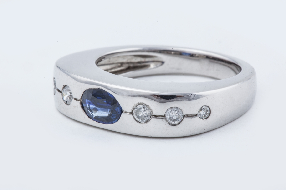 BAGUE en or gris, sertie d'un saphir ovale entre six petits diamants.