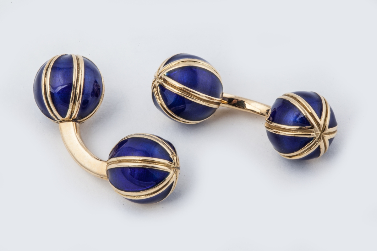 PAIRE DE BOUTONS DE MANCHETTES en or jaune, à décor de boules émaillées bleues