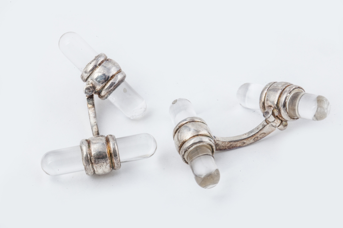PAIRE DE BOUTONS DE MANCHETTES en argent, ornée de bâtonnets de forme cylindrique en verre blanc.