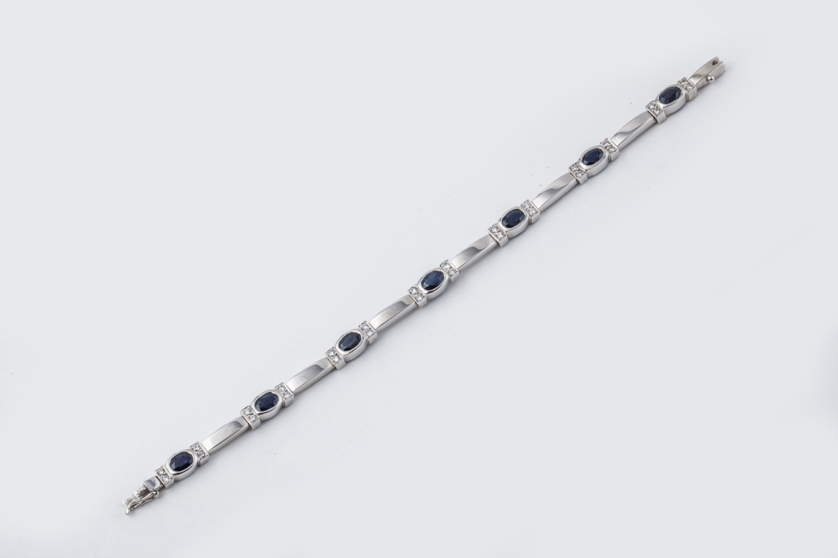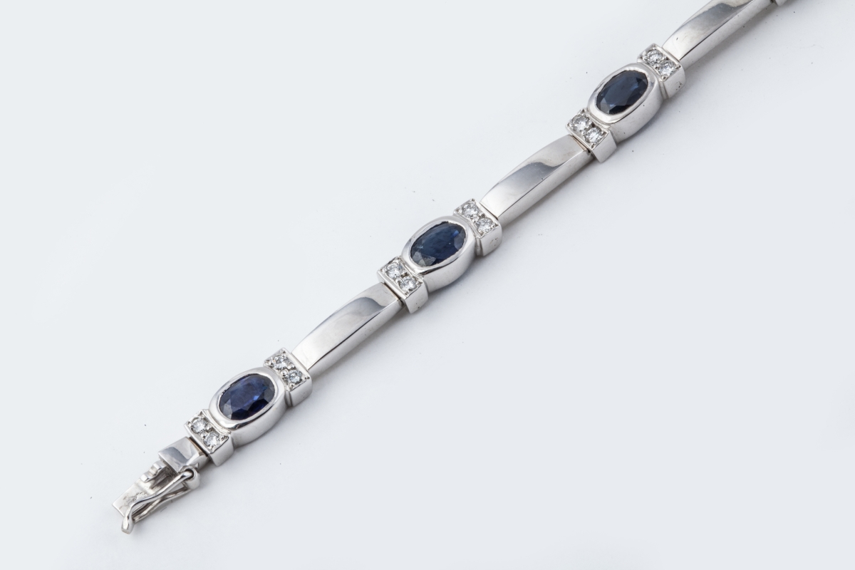 BRACELET articulé en or gris, les maillons rectangulaires partiellement sertis de saphirs de forme ovale entre des petits diamants.