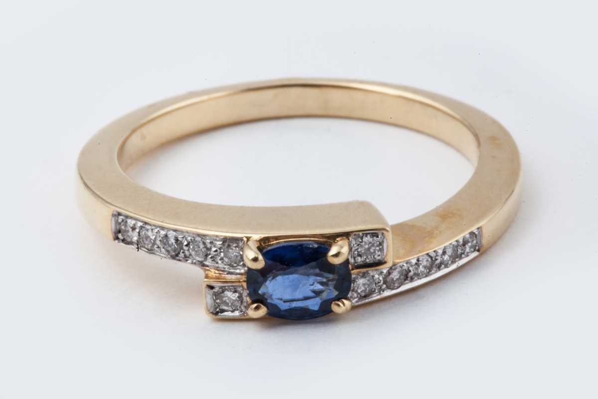 BAGUE en or jaune sertie d'un saphir ovale entre deux lignes de petits diamants.