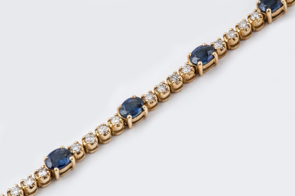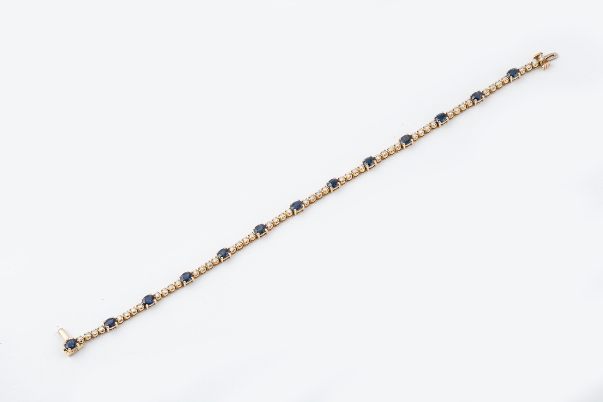 BRACELET articulé en or jaune, serti de saphirs de forme ovale alternés de petits diamants.