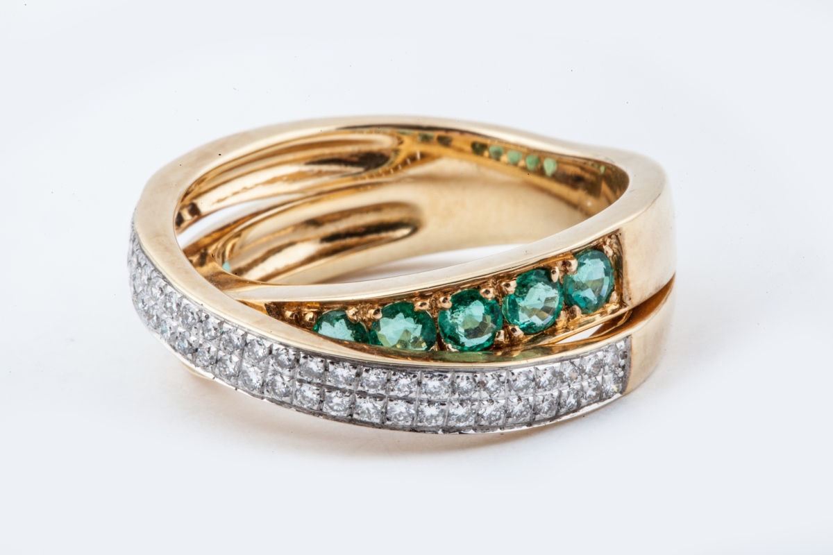 BAGUE en or jaune à entrelacs, décorée d'une ligne d'émeraudes et d'un pavage de diamants ronds.