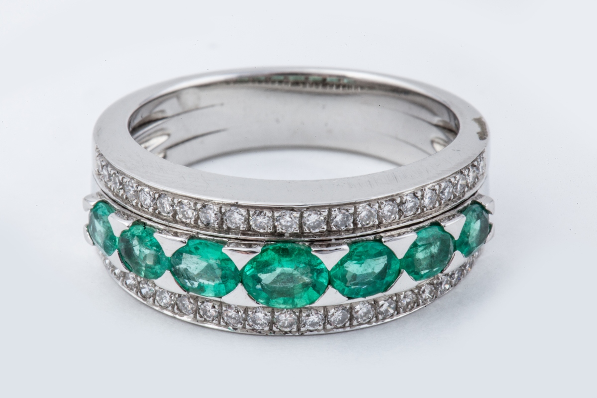BAGUE en or gris, sertie d'une ligne d'émeraudes de forme ovale entre deux lignes de petits diamants.