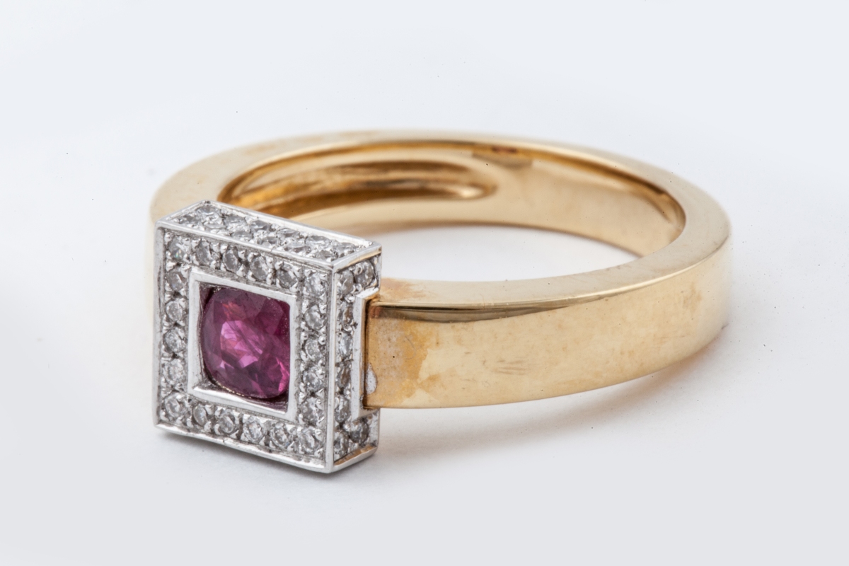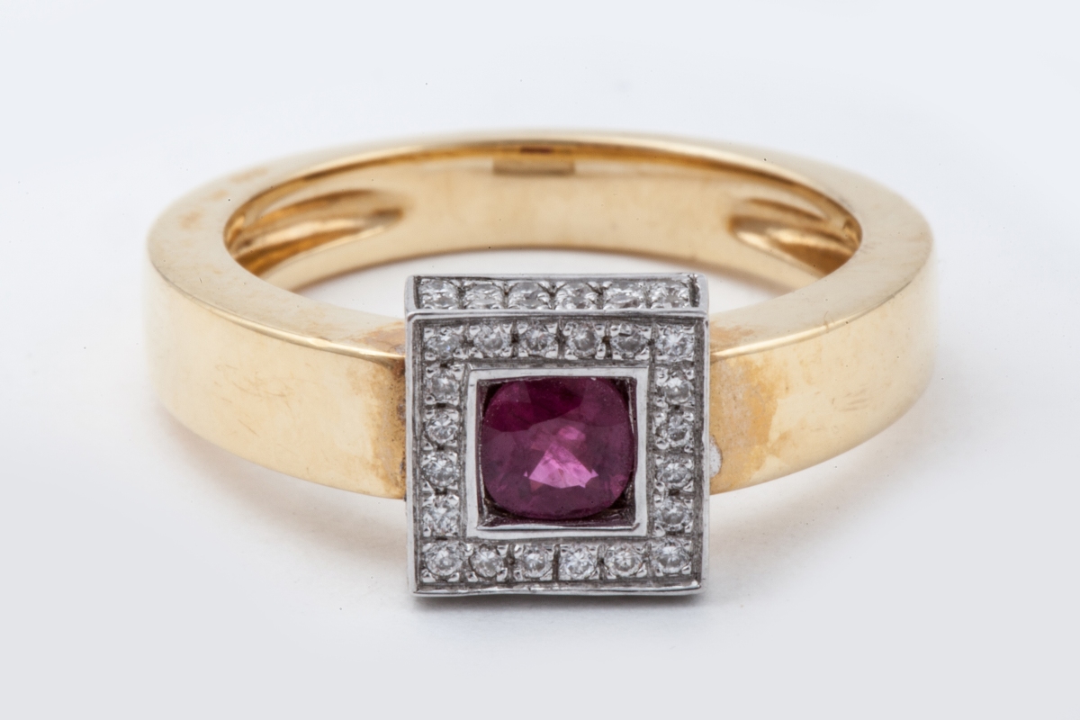 BAGUE en or de deux tons, ornée d'un rubis dans un motif carré entièrement pavé de diamants ronds.