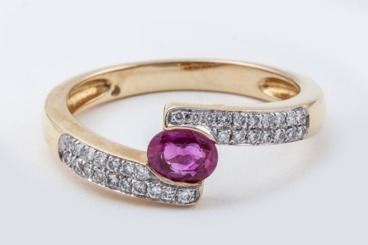 BAGUE en or jaune à décor d'entrelacs, ornée d'un rubis entre deux pavages de diamants.