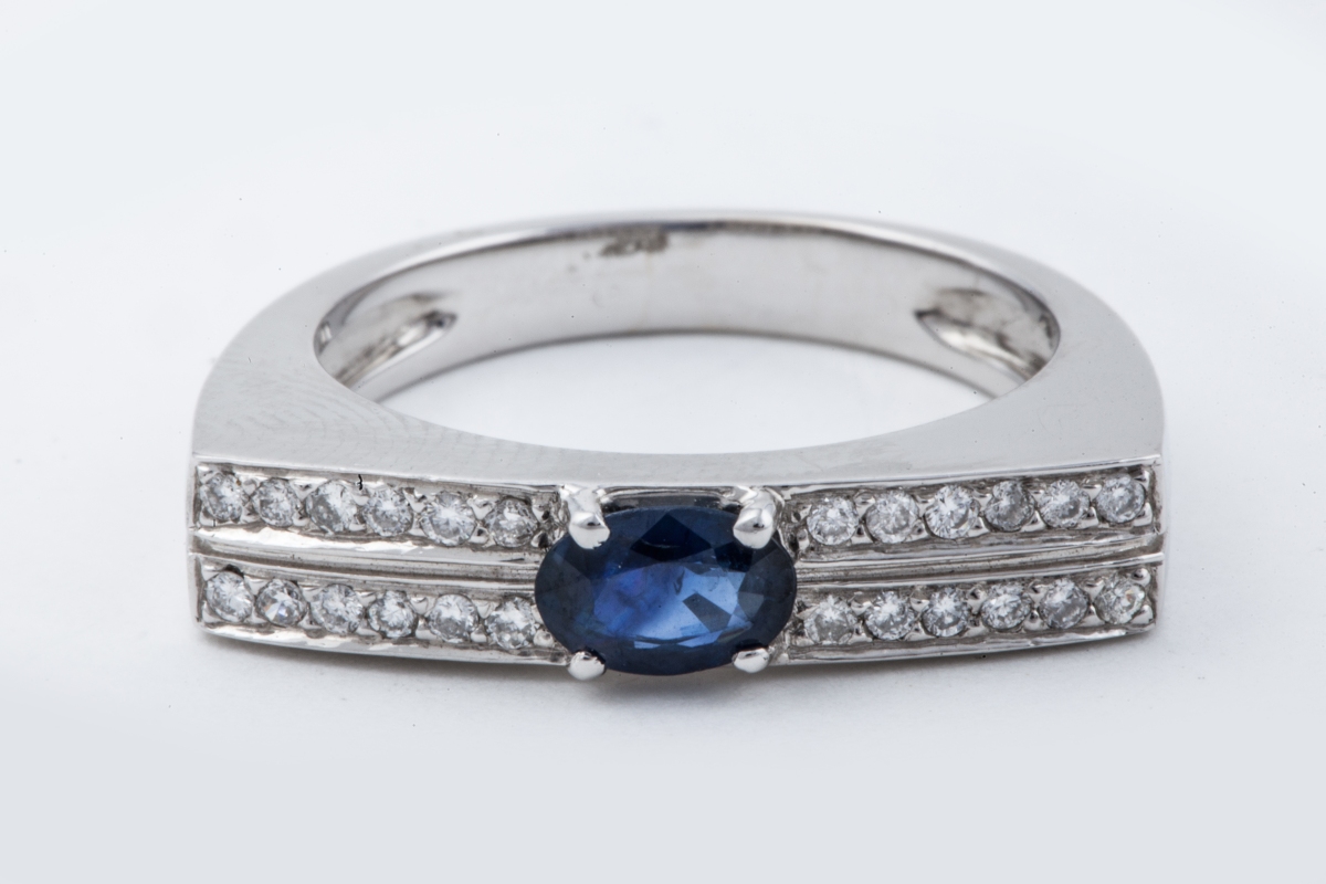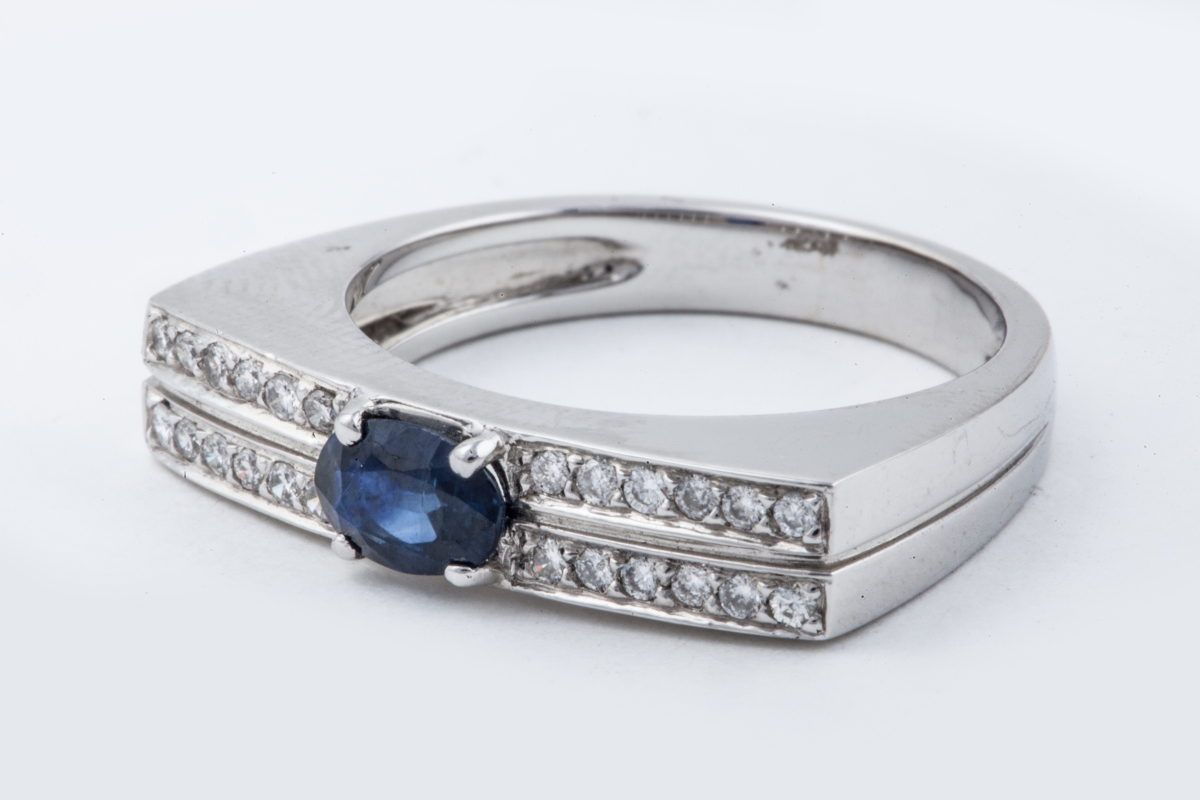 BAGUE en or gris de forme géométrique, ornée d'un saphir de forme ovale entre quatre lignes de diamants.