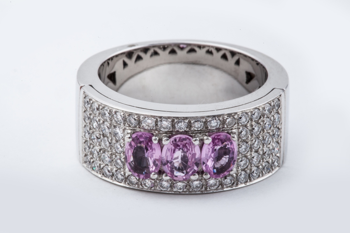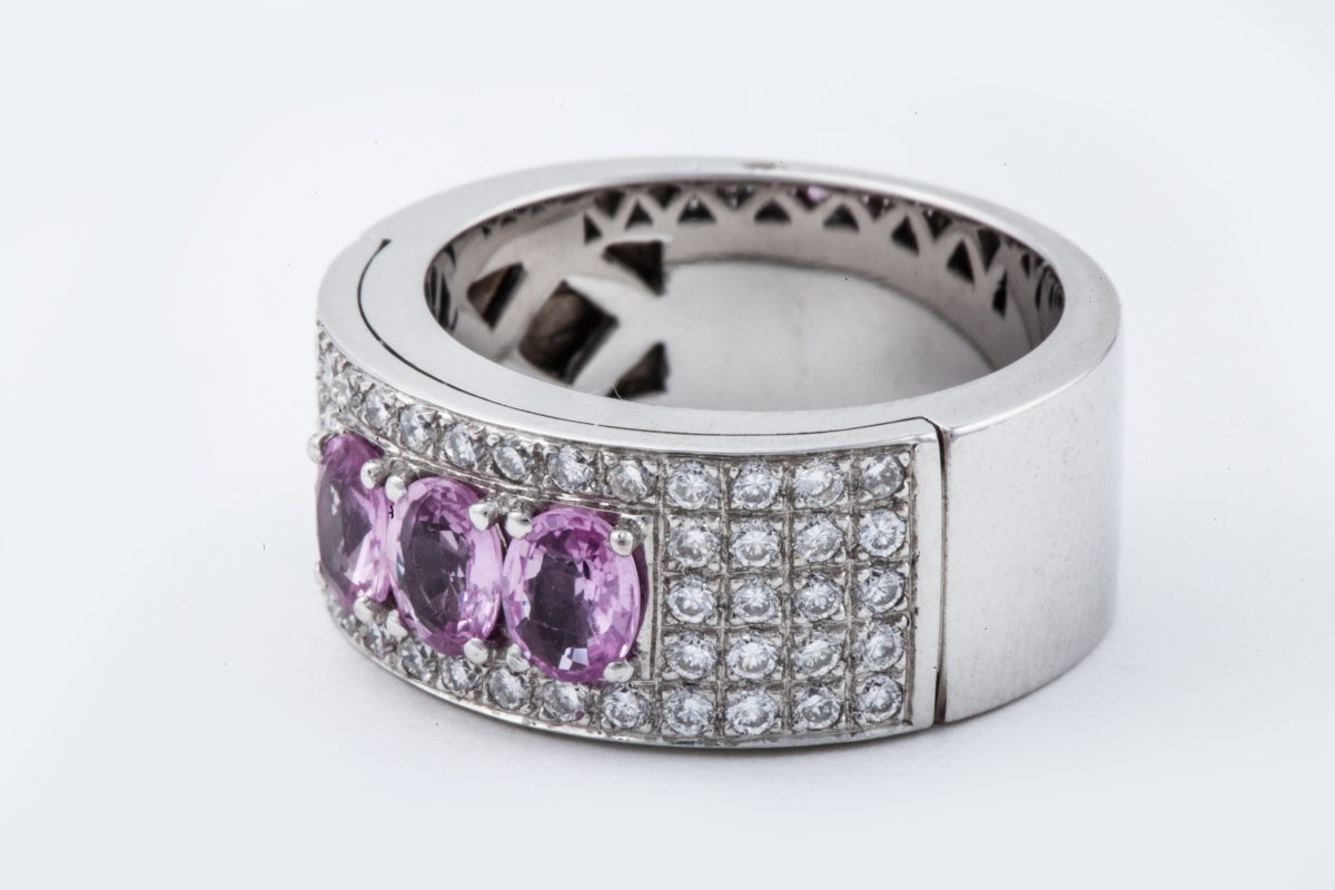 BAGUE bandeau en or gris, ornée de trois saphirs roses dans un pavage de diamants ronds.