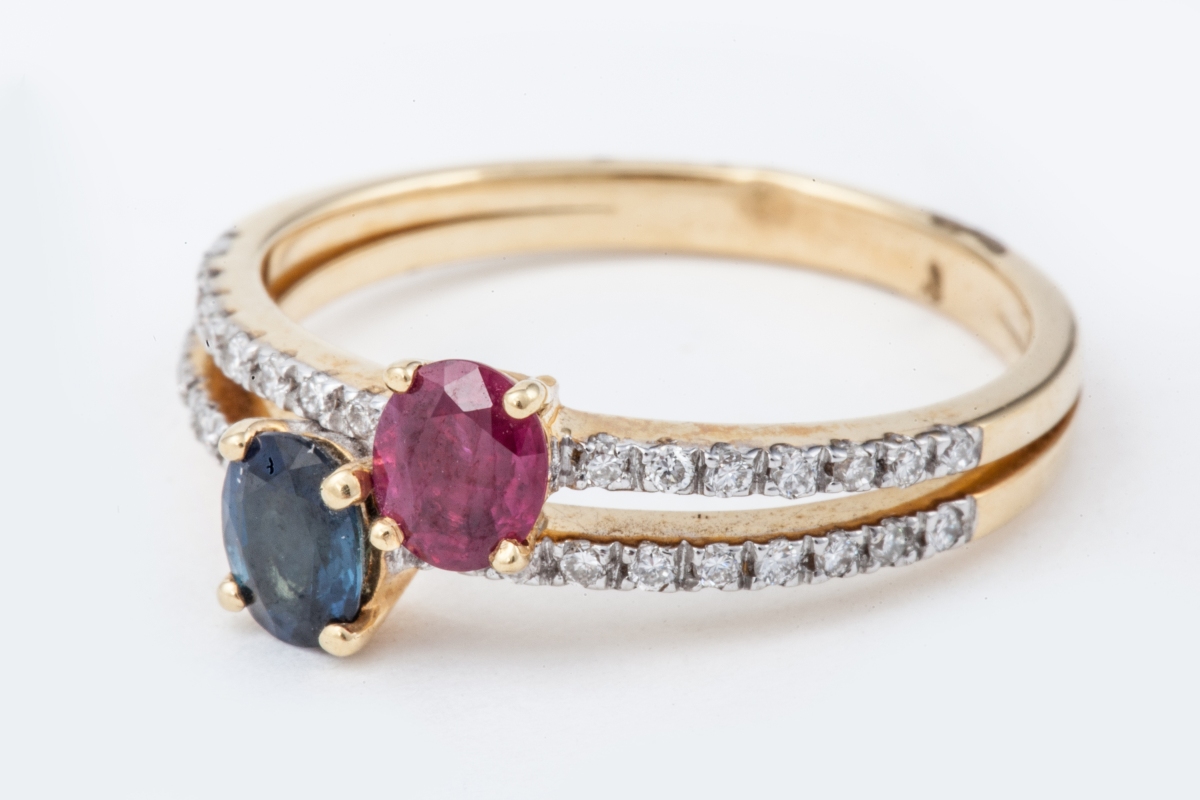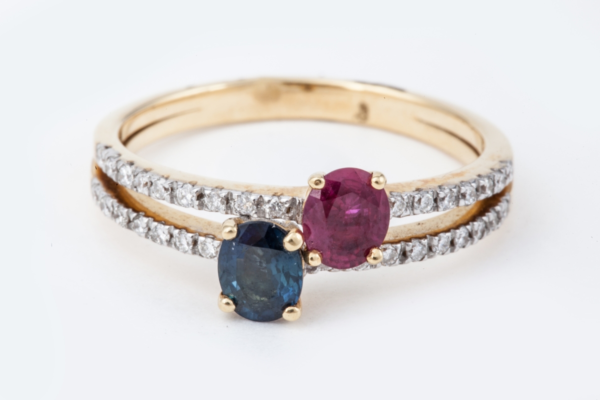 BAGUE en or jaune, sertie d'un rubis et d'un saphir entre des lignes de petits diamants.