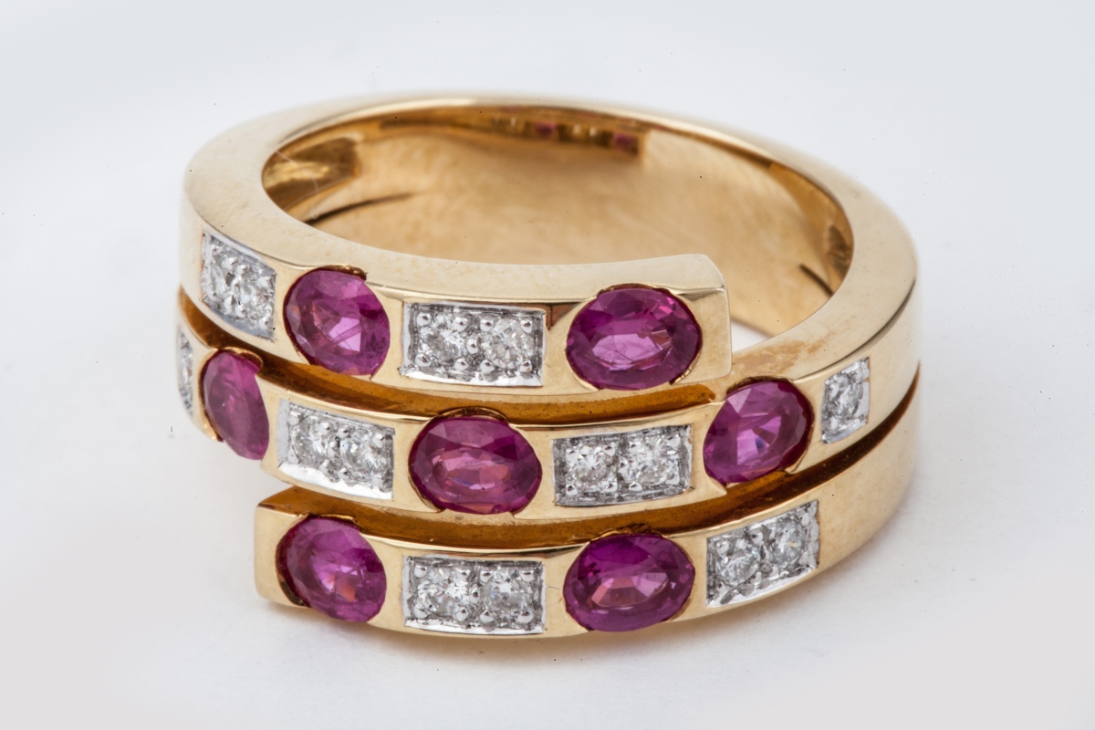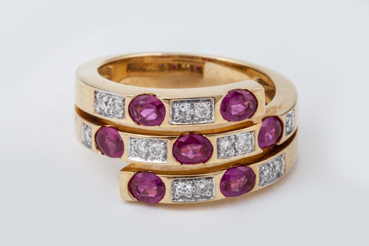BAGUE en or jaune, sertie de rubis de forme ovale entre des motifs ornés de petits diamants ronds.