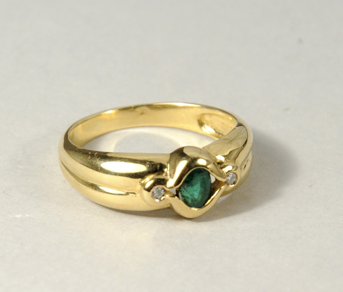 BAGUE en or jaune 18K à décor de godrons, le centre orné d'une ÉMERAUDE ovale entre deux petits DIAMANTS ronds de taille brillant.