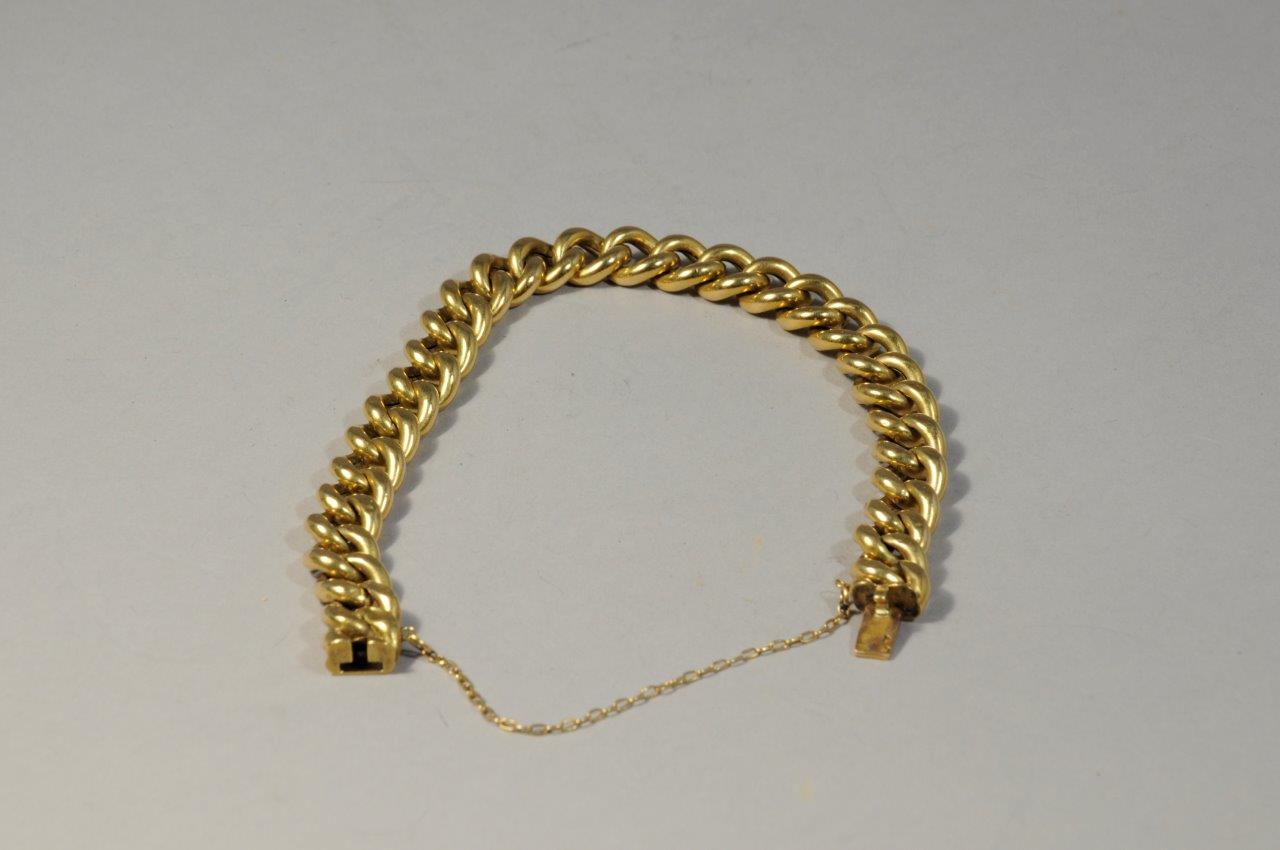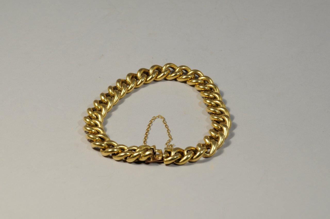 GOURMETTE en or jaune à larges mailles gourmettes, le fermoir retenu par une chaînette.