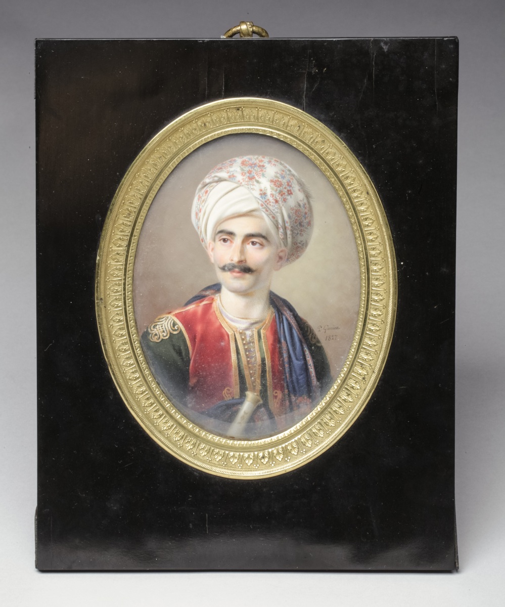 Paul GOMIEN. Pair of MINIATURE PORTRAITS. Portrait of a man in Turkish costume. Portrait of a man in a frock coat. Signed and dated 1827. Conserved in their original ebony and bronze frames.