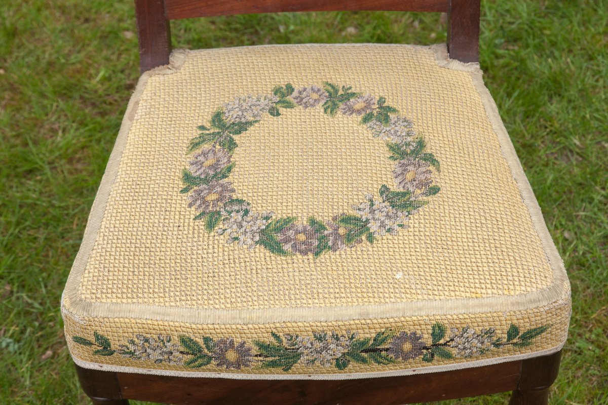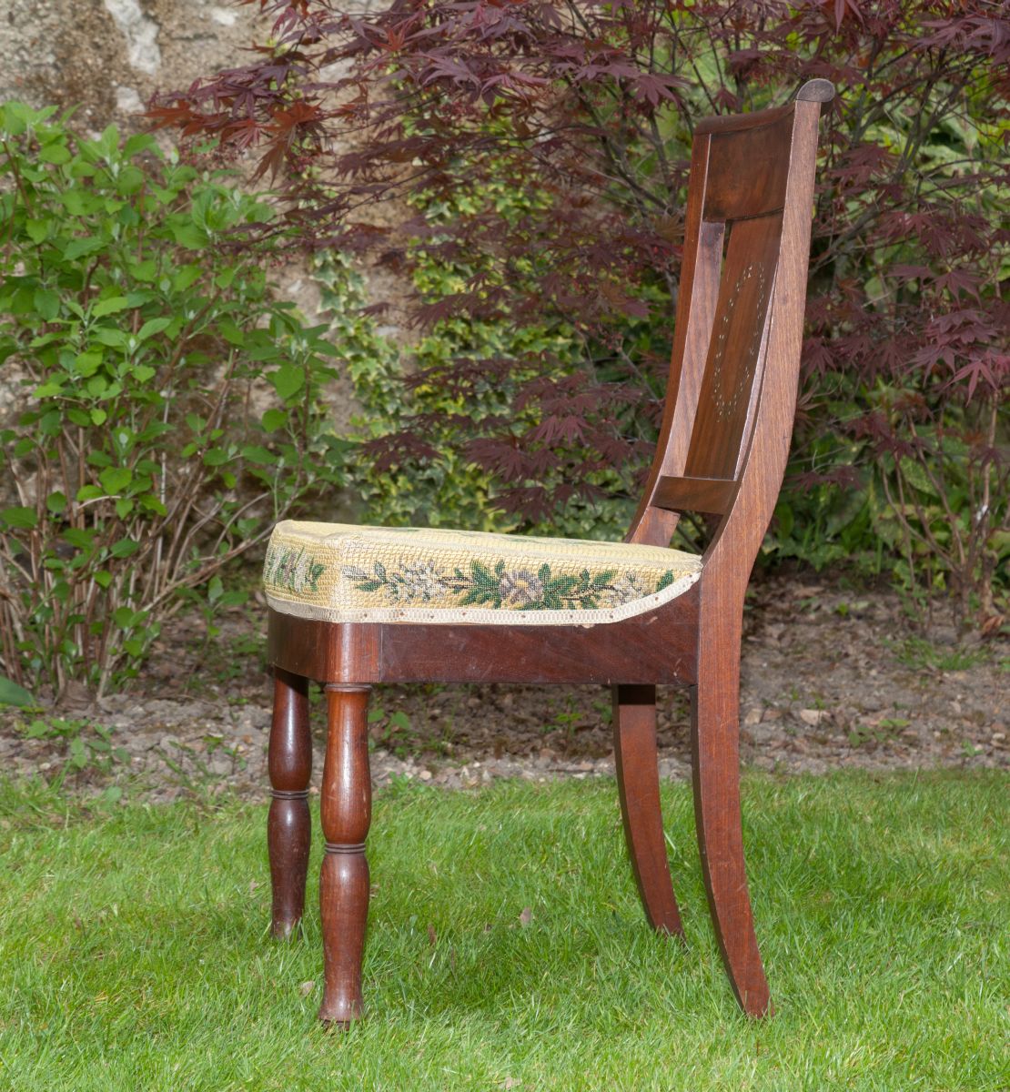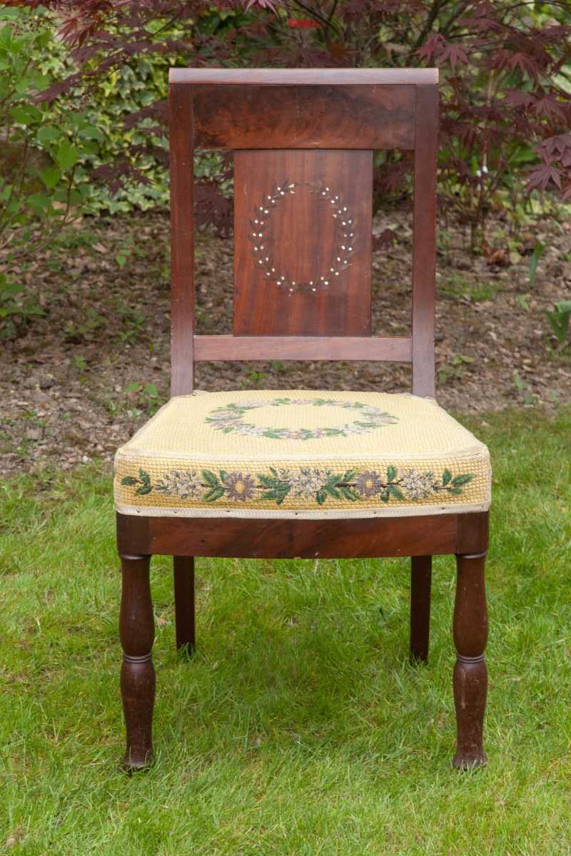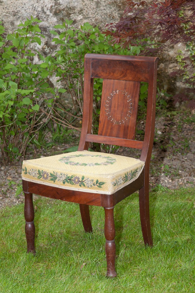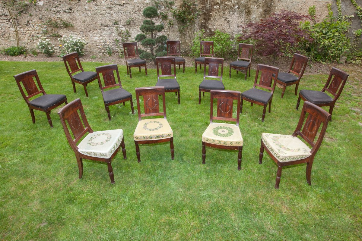 A GROUP OF EIGTHEEN DINNER TABLE CHAIRS in the style of JACOB-DESMALTER. Mahogany base, inlaid. Empire, first quarter of the 19th century.