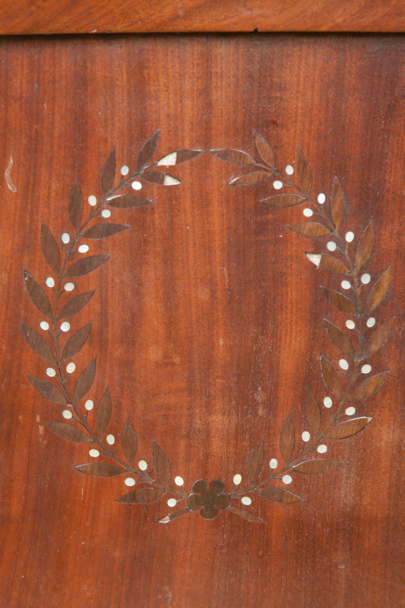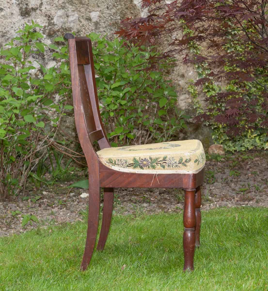 SUITE de DIX-HUIT CHAISES de SALLE À MANGER en acajou et placage d'acajou. Dossier à bandeau incrusté en son centre d'une couronne de laurier incrustée de pastilles en nacre. La ceinture arrondie repose sur des pieds antérieurs à double-balustre et des pieds postérieurs sabre.
