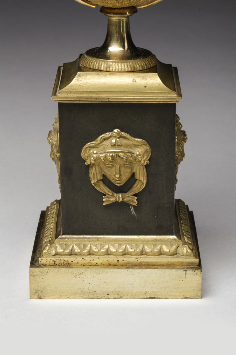 BRÛLE-PARFUM en bronze doré figurant un vase couvert sur piédouche à l'antique. Le couvercle ajouré est terminé en bourgeon de lotus et les anses à motifs de griffons. Il repose sur une base à section rectangulaire ornée de têtes de femmes sur un fond de bronze patiné terminé par une frise de fleurs de lotus.