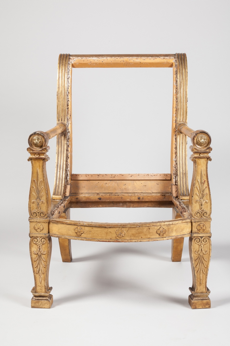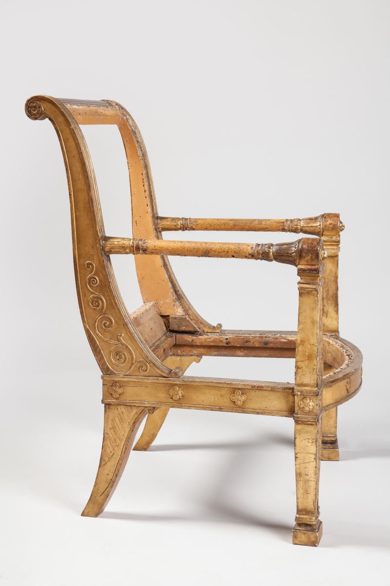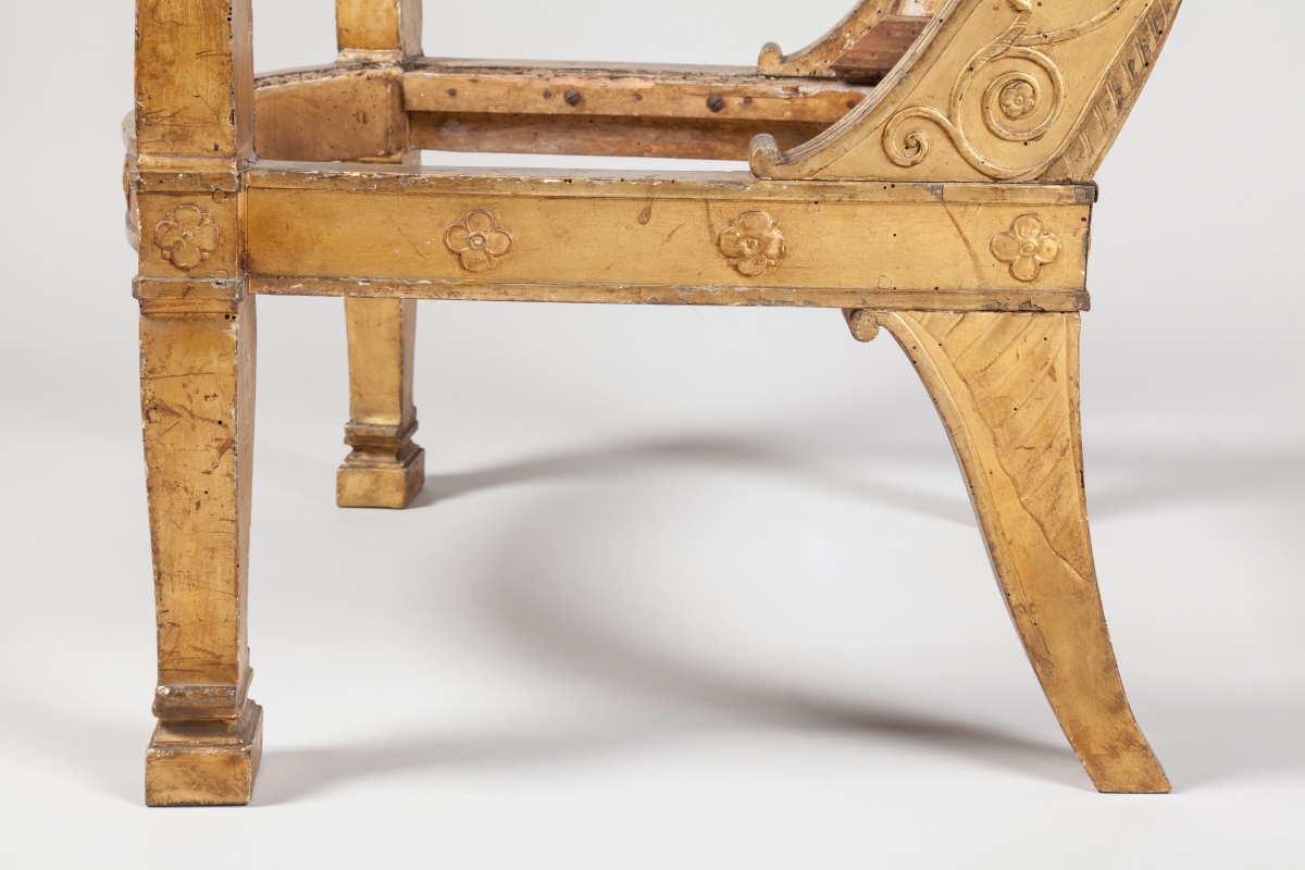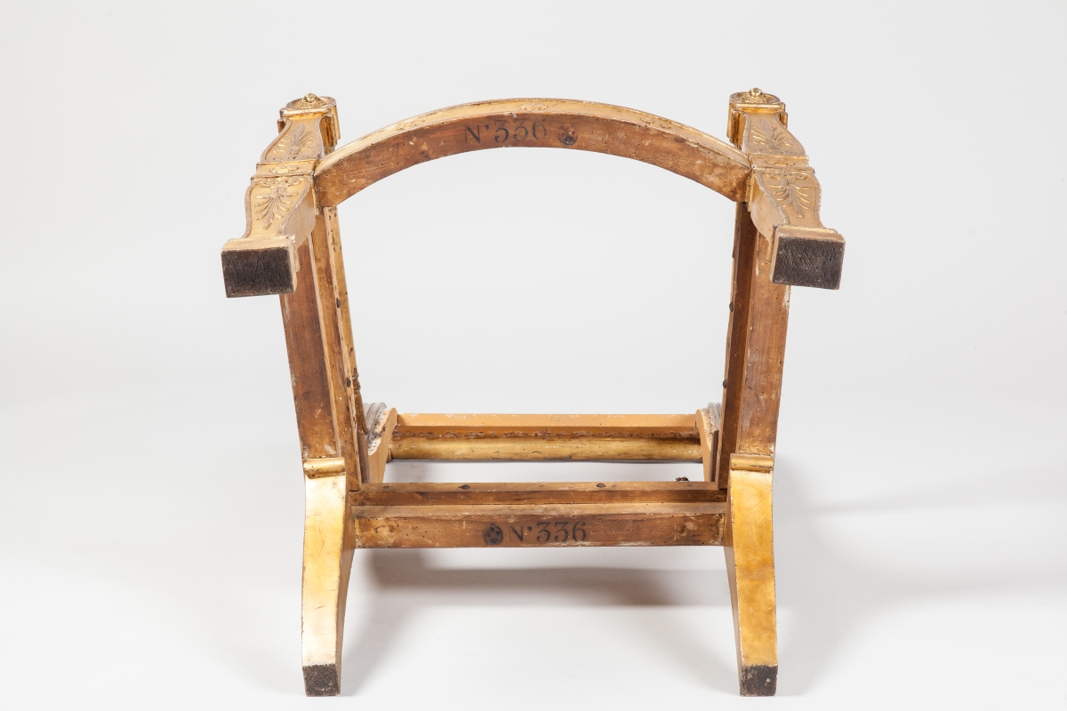 Fût de FAUTEUIL D'APPARAT en hêtre sculpté et doré, à dossier cannelé renversé orné d'arabesques. Les accotoirs droits, en sceptre égyptien avec un décor de fleurs de lotus, sont terminés par des protomés de lion appliqués, en bronze ou en laiton. Il repose sur deux pieds antérieurs en pilastres, ornés de palmes et feuilles d'acanthe et deux pieds postérieurs sabres, à motifs d'ailes de chauve-souris. La ceinture est ornée toutes faces de fleurettes.