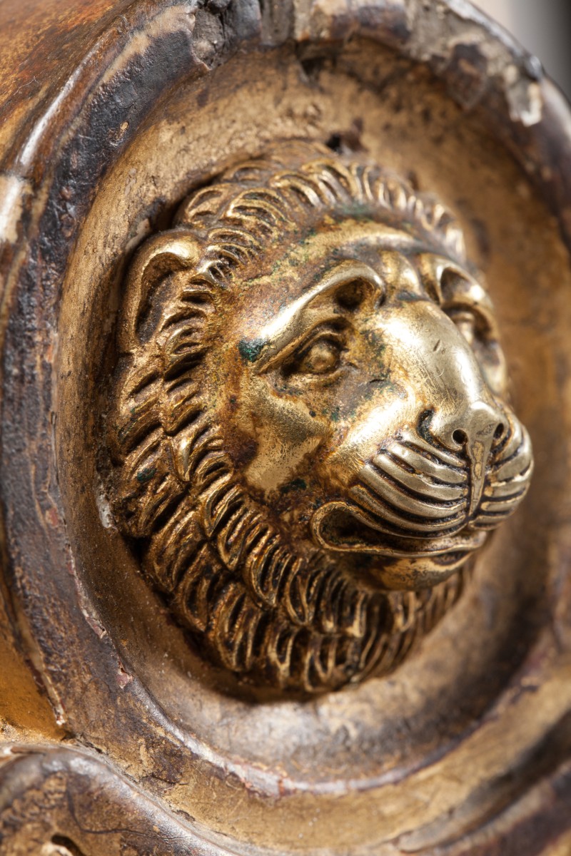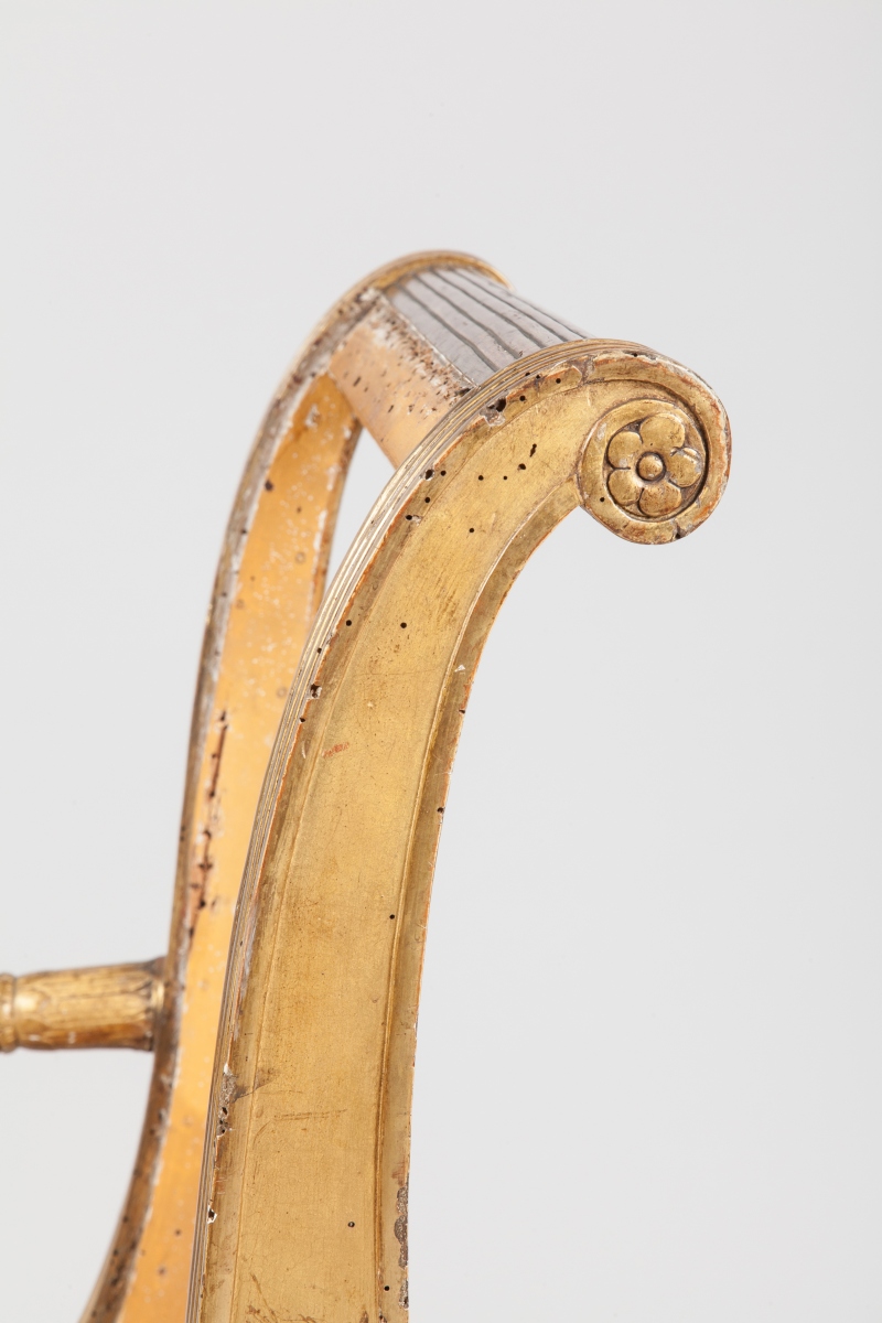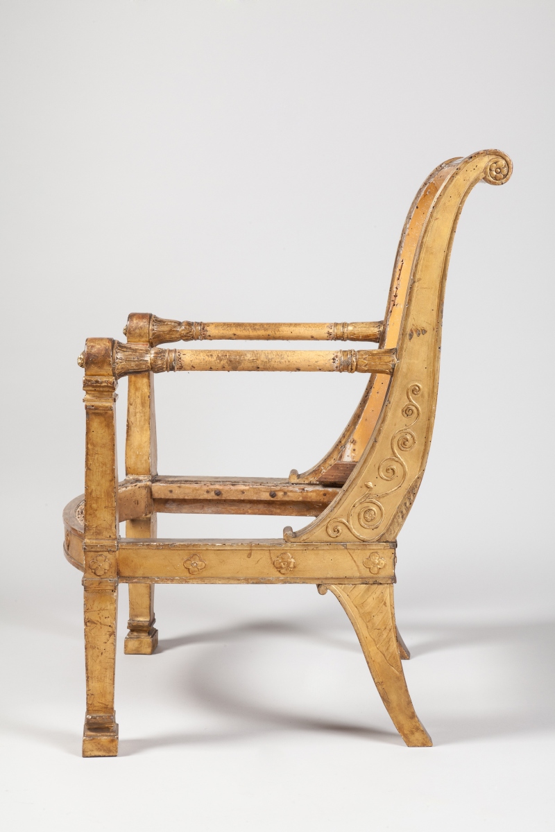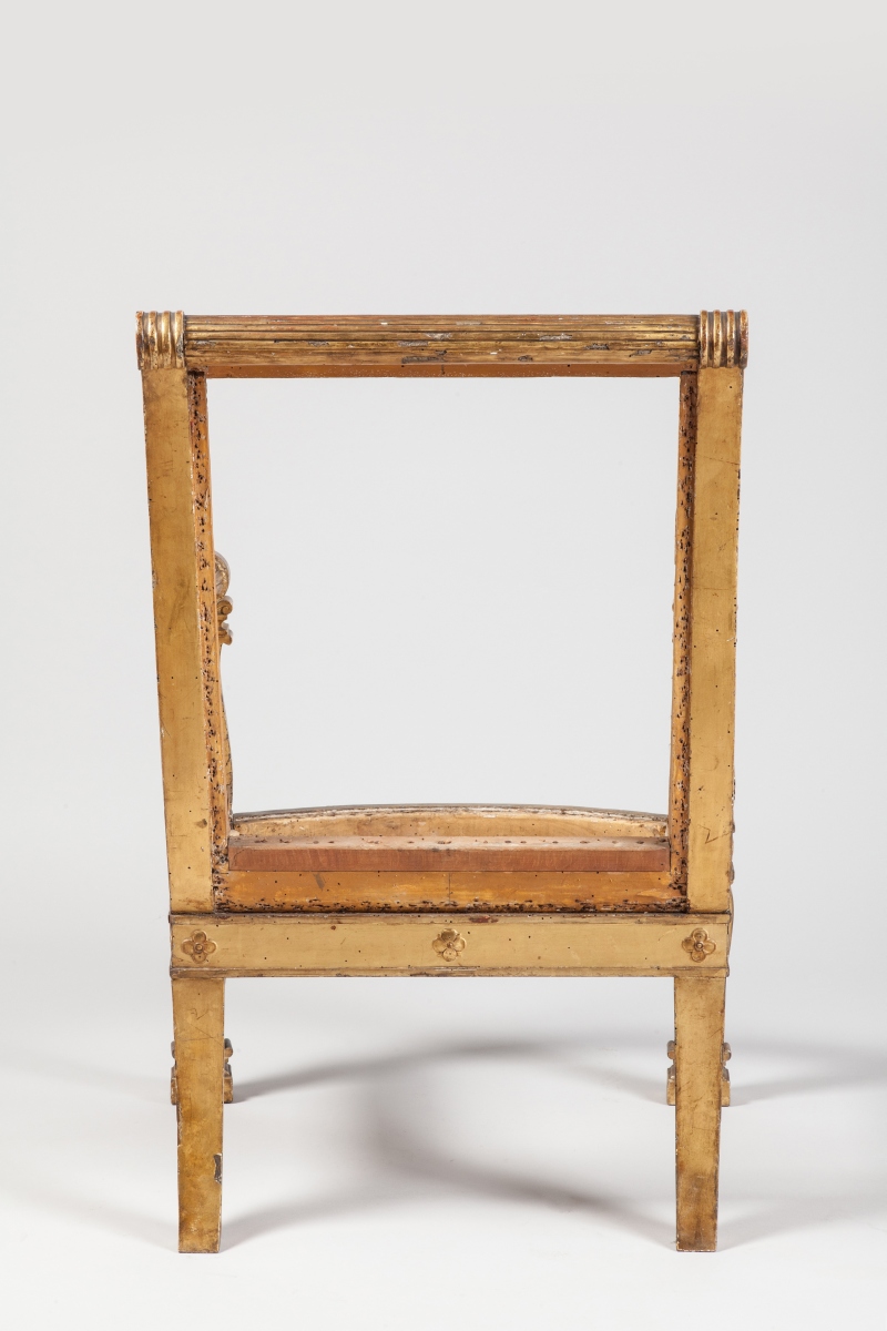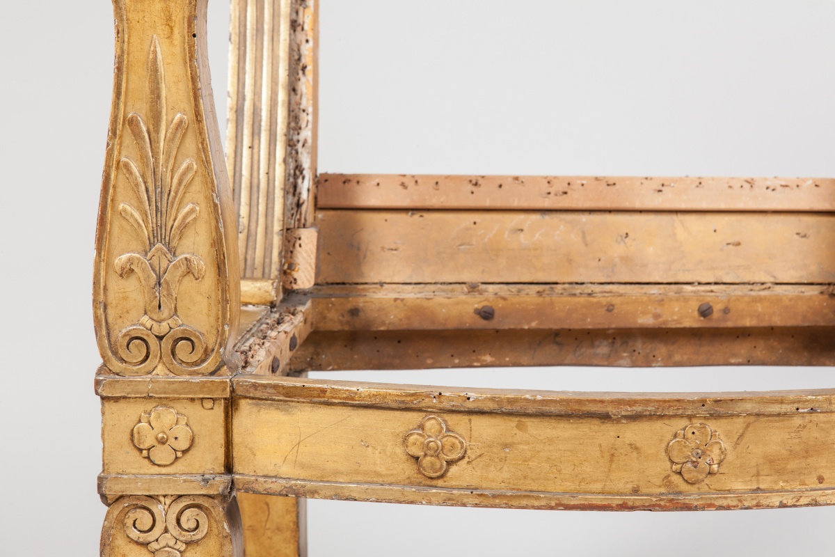 Fût de FAUTEUIL D'APPARAT en hêtre sculpté et doré, à dossier cannelé renversé orné d'arabesques. Les accotoirs droits, en sceptre égyptien avec un décor de fleurs de lotus, sont terminés par des protomés de lion appliqués, en bronze ou en laiton. Il repose sur deux pieds antérieurs en pilastres, ornés de palmes et feuilles d'acanthe et deux pieds postérieurs sabres, à motifs d'ailes de chauve-souris. La ceinture est ornée toutes faces de fleurettes.