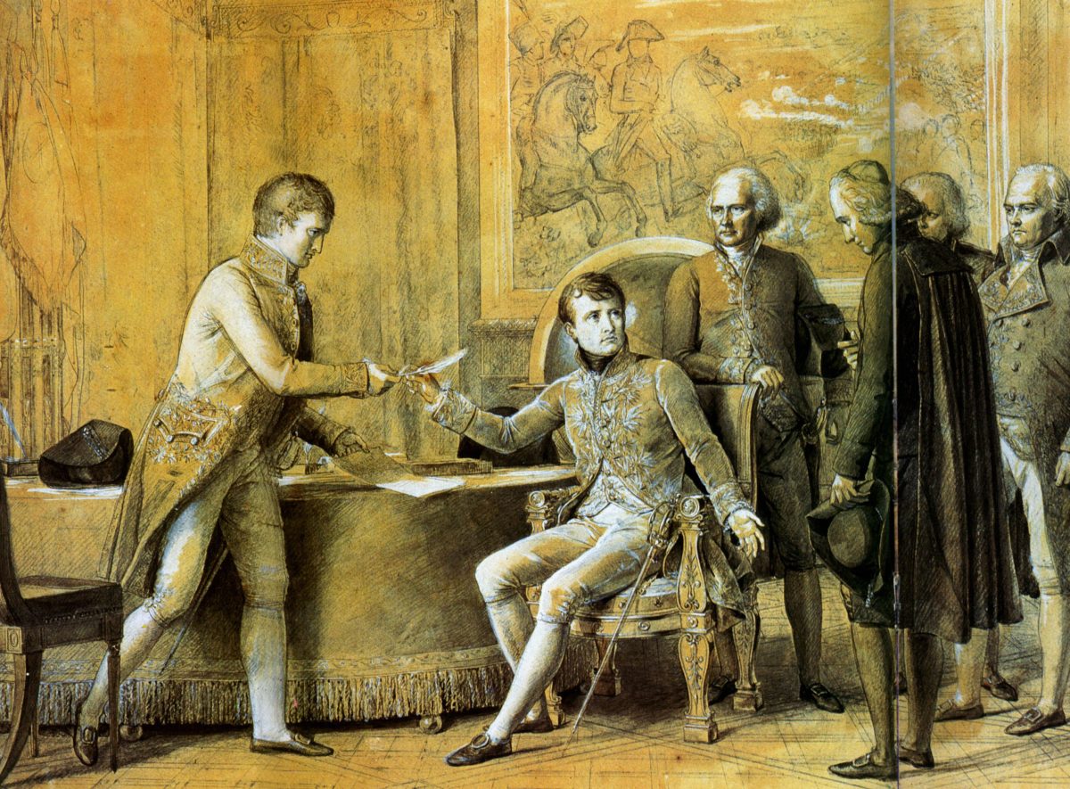 Signé de Georges Jacob (Cheny, 1739 - Paris, 1814), notre fauteuil pourrait être un prototype au destin fameux. La première estampille de ce siège n'est plus utilisée par le père de la dynastie d'ébénistes après 1796. Or, le plus ancien témoignage sur ce meuble remonte à 1801 : ses têtes de lion apparaissent en effet sur un dessin de François Gérard, conservé au musée de Versailles. Bonaparte y est assis alors qu'il s'apprête à signer le Concordat, le 15 juillet 1801, au palais des Tuileries. Le modèle est en tout point identique au nôtre, à l'exception des pieds postérieurs, qui sont au modèle des pieds antérieurs.