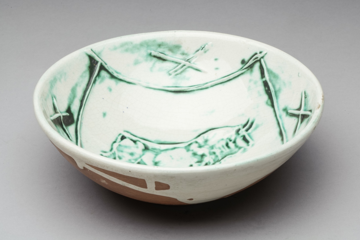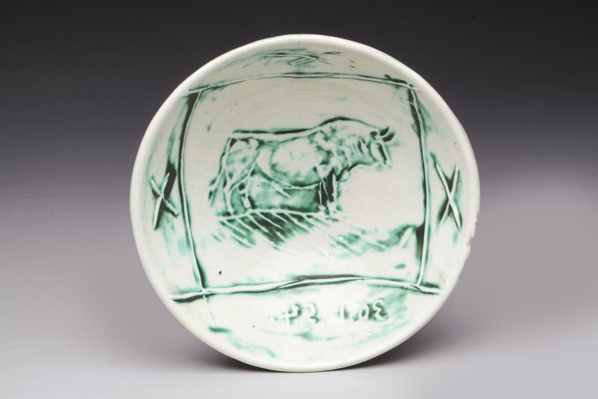 Pablo PICASSO. Pair of little ROUNDED DISHES in MADOURA ceramic. Decorated with bull figures. Dated 30.1.54 and 54 and marked with a legend. Original Picasso mark.
