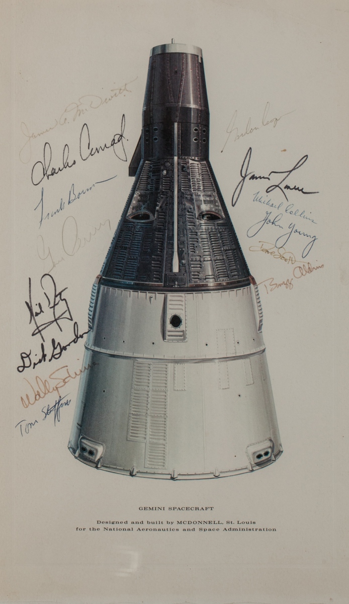 Gravure en couleurs "Gemini spacecraft. Designed aud built by Mcdonnel, St. Louis for the National Aeronautics and Space Administration" - comportant 14 signatures d'astronautes.