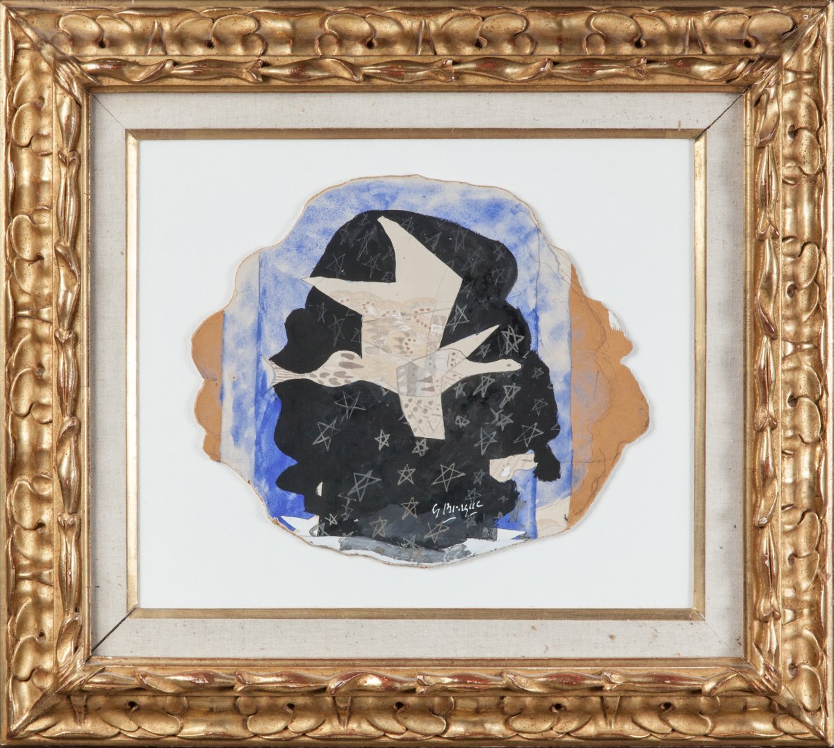 Georges BRAQUE. Bird and stars. Watercolor, gouache and crayon on paper glued on cardboard. Signed lower right. This painting has been published in front page of the Galerie Maeght review "Derrière le miroir", #115, in 1959. It is considered as the synthesis of Braque`s work.