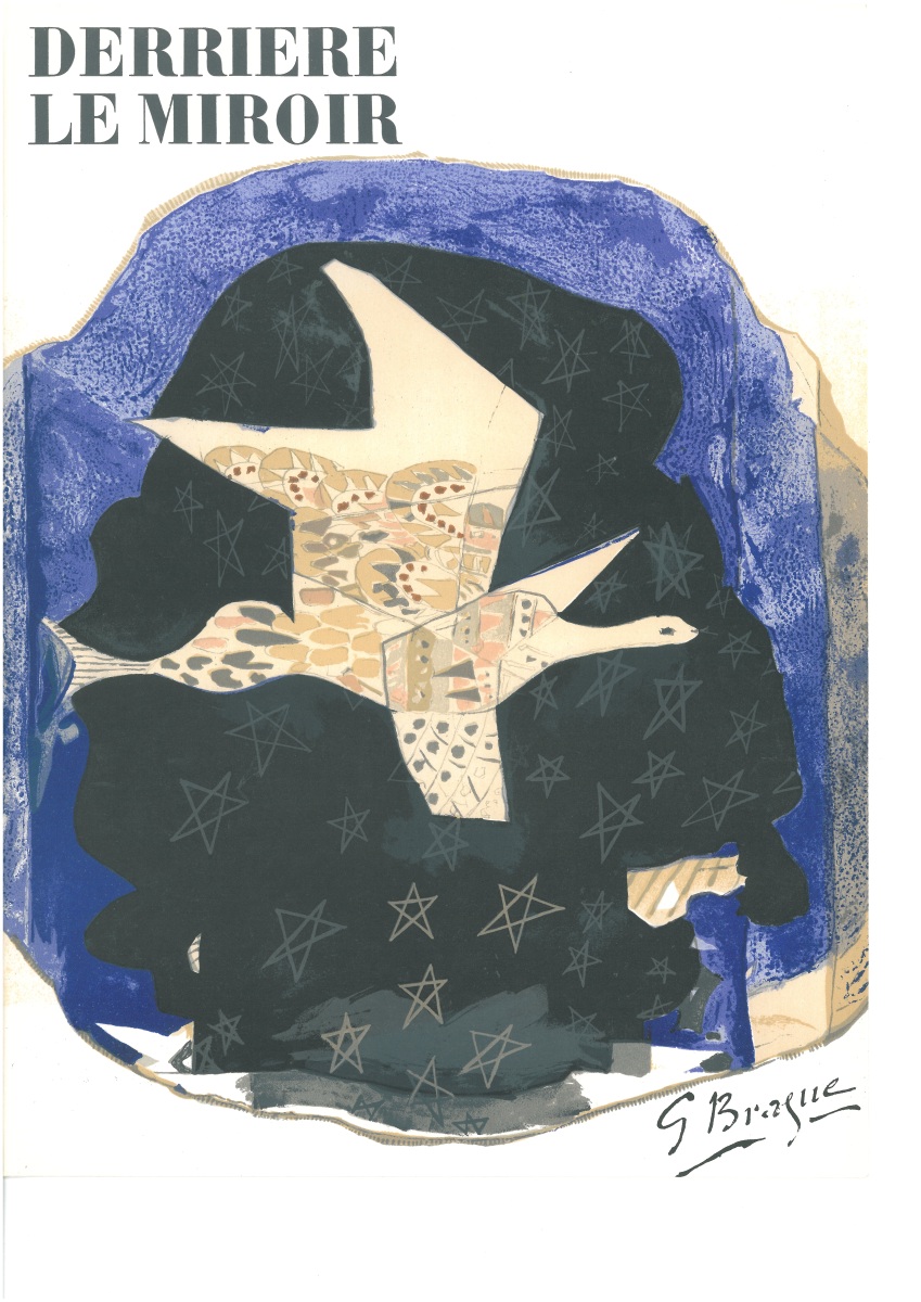 Ainsi à ses premiers papiers collés de 1912-1914 avec Picasso, il y revient 45 ans plus tard, en introduisant la couleur, à côté du noir certes mais avec ces marron et crème, et surtout ce bleu marbré. Le thème très simple de l'oiseau (1954-1962) est stimulé par une commande en 1955 d'un plafond pour la salle étrusque du Louvre. Dès les dessins préparatoires dès 1953, on retrouve ces oiseaux volant parmi les étoiles.