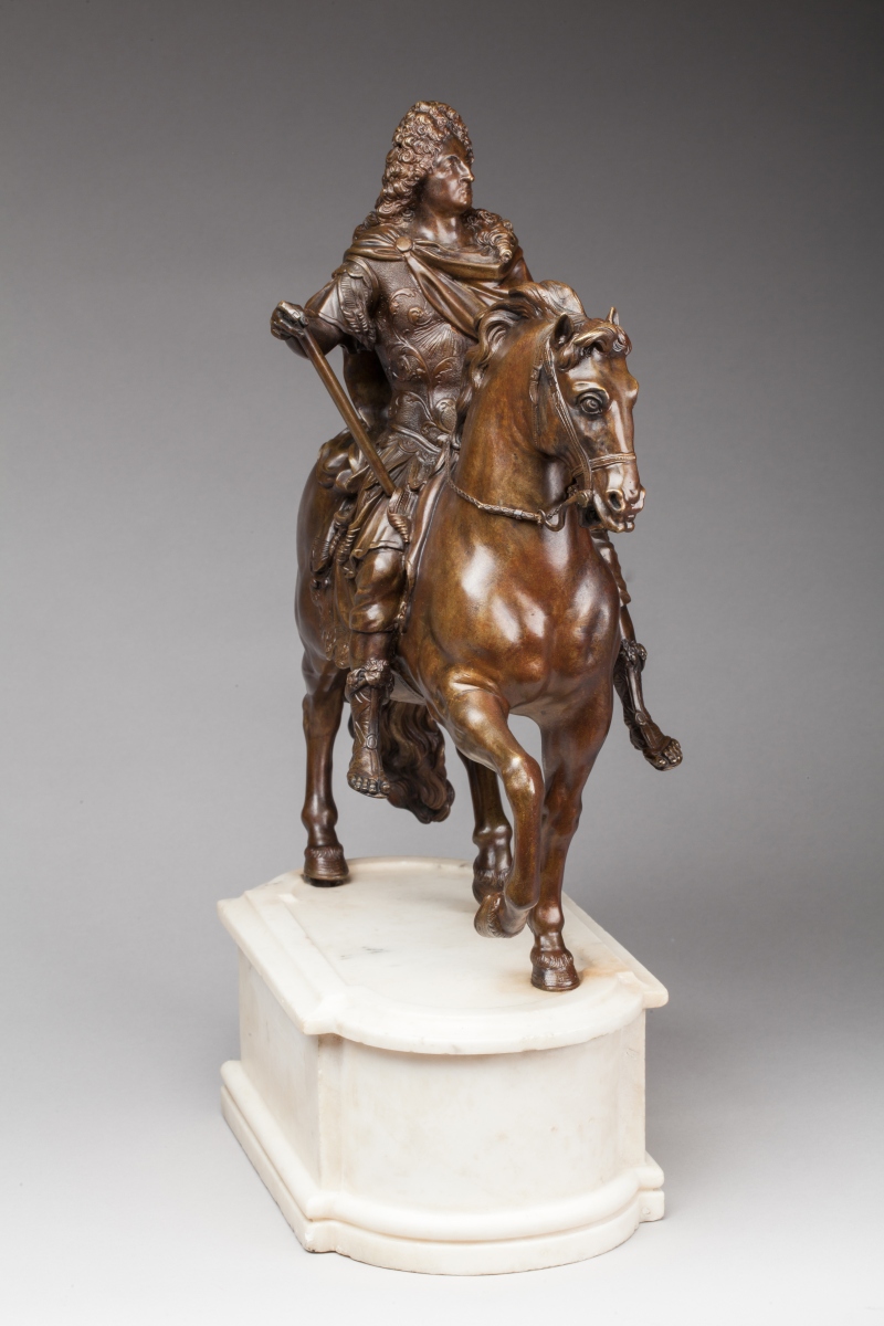 L'histoire de notre bronze est établie : il ne s'agit pas de l'exemplaire personnel du Roi, aujourd'hui non identifié, mais celui de l'architecte exécuteur de la place royale de Dijon : Martin Durey comte de Noinville (c. 1658-1728). Né à Paris, il passe pour être un fils naturel du Grand Condé, dans l'armée duquel il est ingénieur géographe. Il s'installe à Dijon en mai 1682, comme inspecteur du bâtiment des États de Bourgogne, sous la direction des architectes Gittard puis Mansart. Il fait toute sa carrière dans l'ancienne cité des ducs de Bourgogne, avec la confiance du Premier architecte du roi. Actif jusqu'à la fin de sa vie, il collabore encore en 1724 avec Jacques Gabriel à l'érection du piédestal de la statue de Louis XIV. Notre groupe arrive par alliance à Orléans en 1882, dans l'hôtel particulier des Raguenet de Saint-Albin, échevins orléanais et industriels du sucre. Il échappe miraculeusement, en 1944, à l'incendie de leur hôtel de la rue d'Illiers et de ses collections ; il avait été précautionneusement enfoui au fond du parc d'une propriété de Sologne, quelques années plus tôt. Cet enfouissement explique l'atténuation de la patine brune originale. La queue a été restaurée et le rêne droit manquant moulé d'après le gauche. En l'absence de marque d'usure sur le flanc gauche, l'épée est présumée n'avoir jamais été disposée.