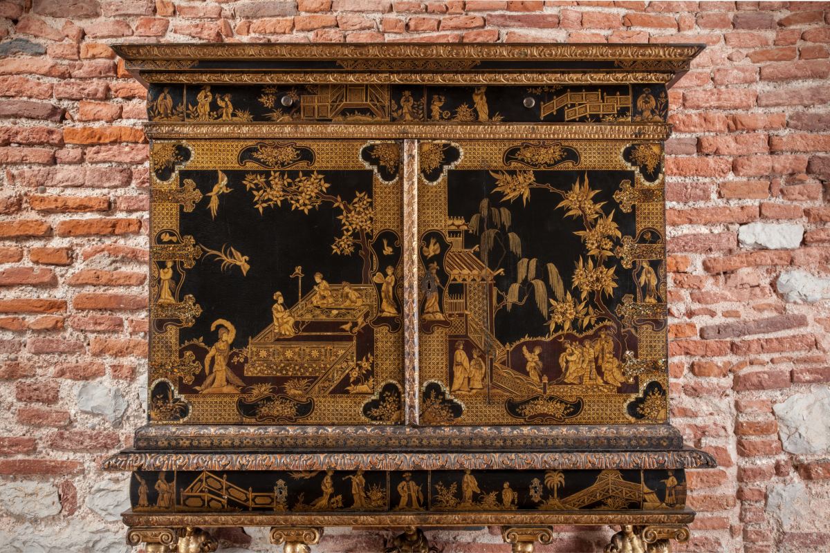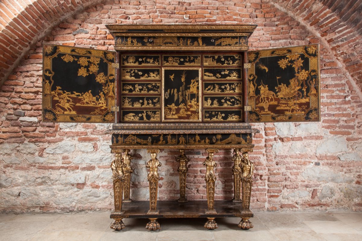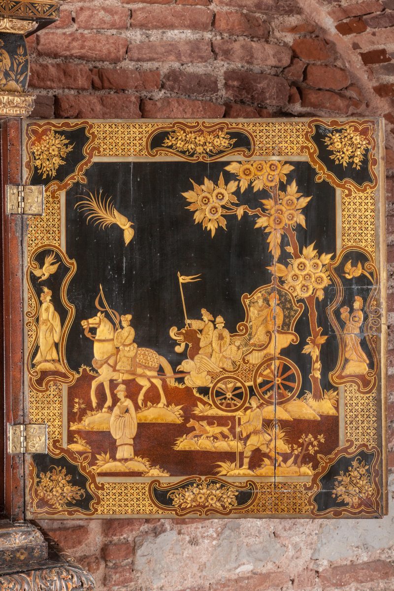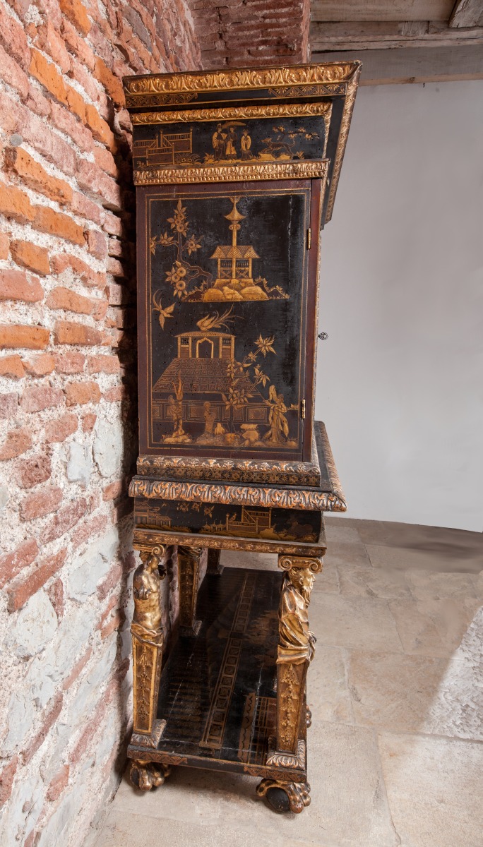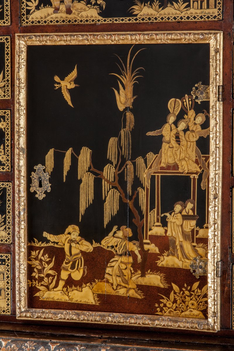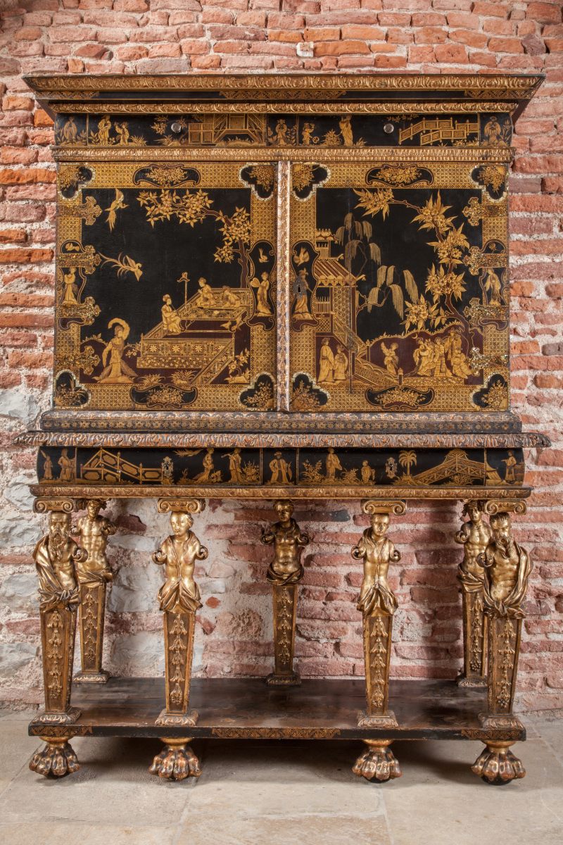 Exceptional LAQUERED CABINET representing the fable of the Prince and the bird, and a series of exotic animals. The cabinet rests on a richly ornamented base with seven terms in sculpted and gilded wood. Parisian work of the time of Louis XIV, c. 1670-1680. Probably for the royal court of Portugal.