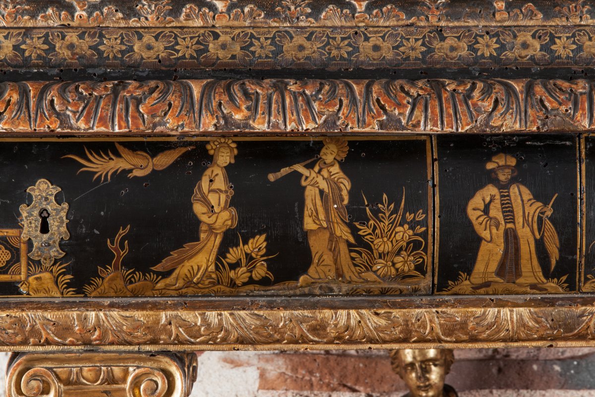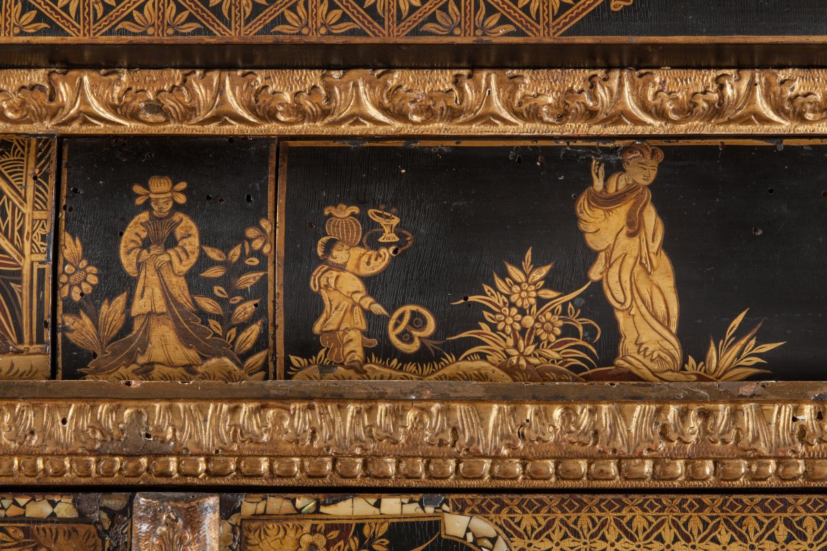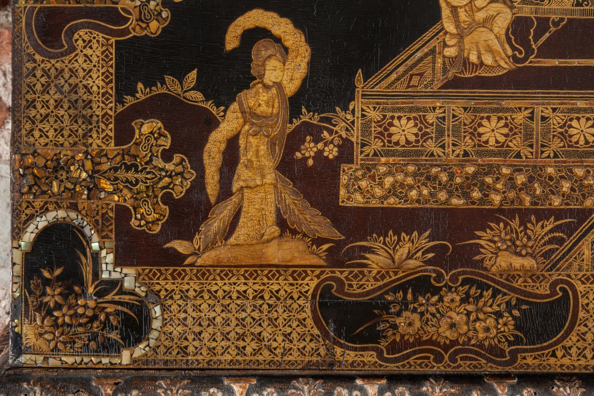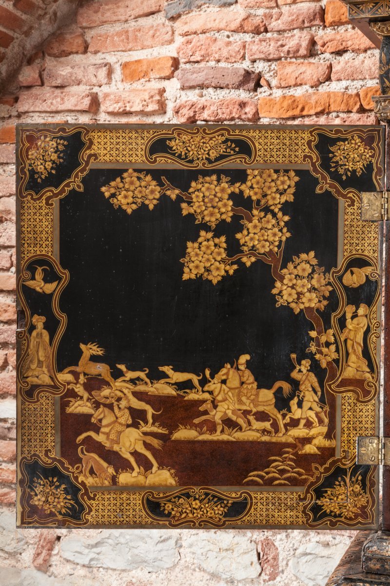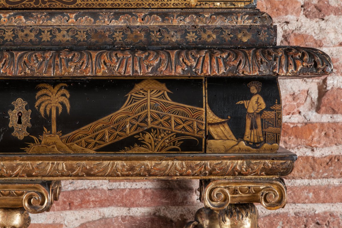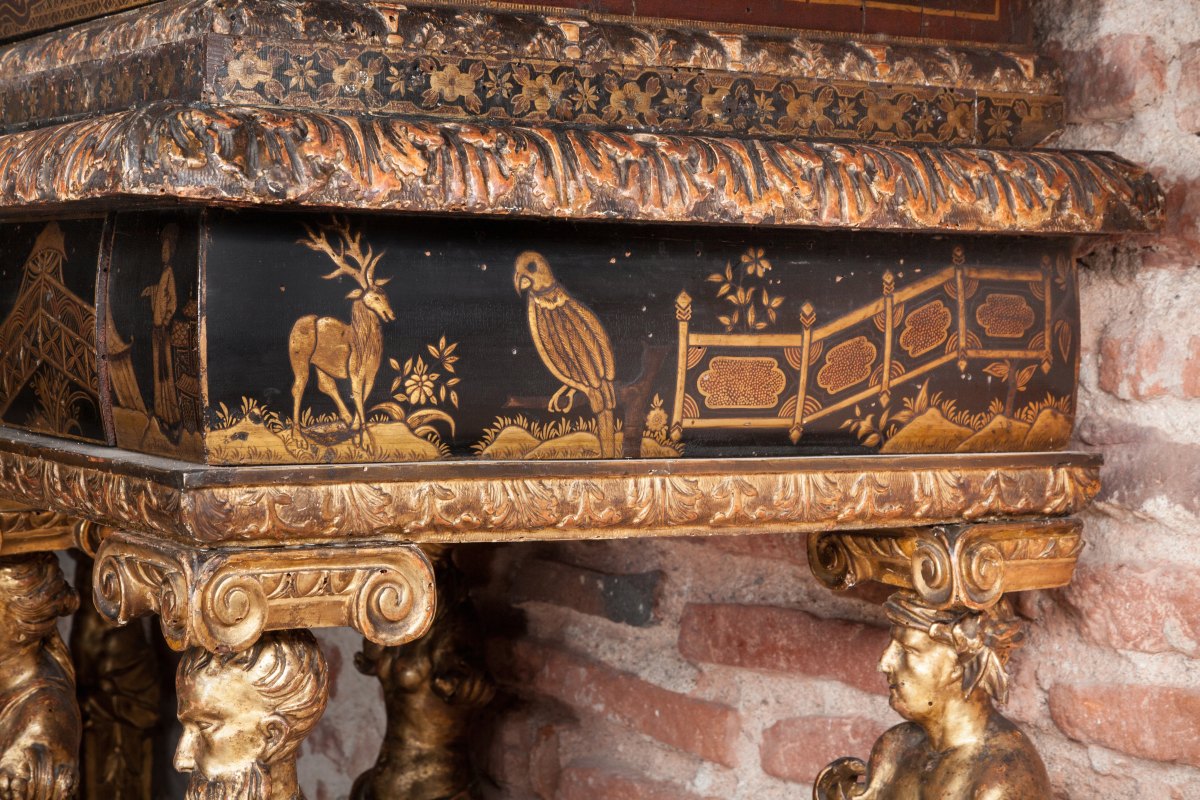 Exceptional LAQUERED CABINET representing the fable of the Prince and the bird, and a series of exotic animals. The cabinet rests on a richly ornamented base with seven terms in sculpted and gilded wood. Parisian work of the time of Louis XIV, c. 1670-1680. Probably for the royal court of Portugal.